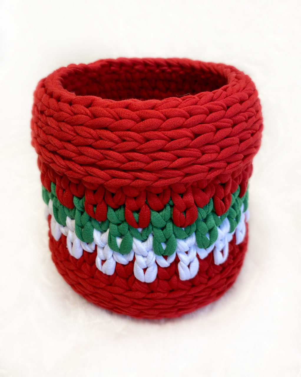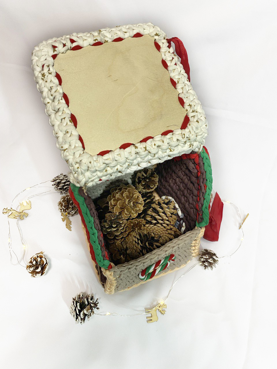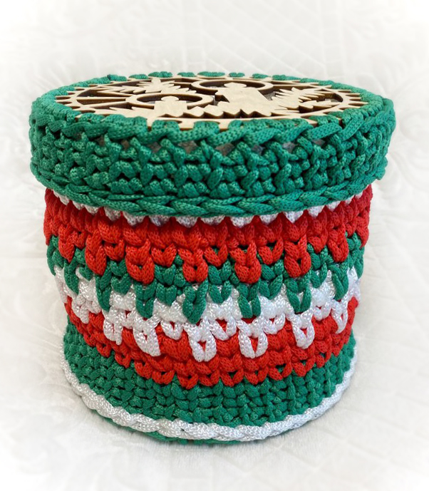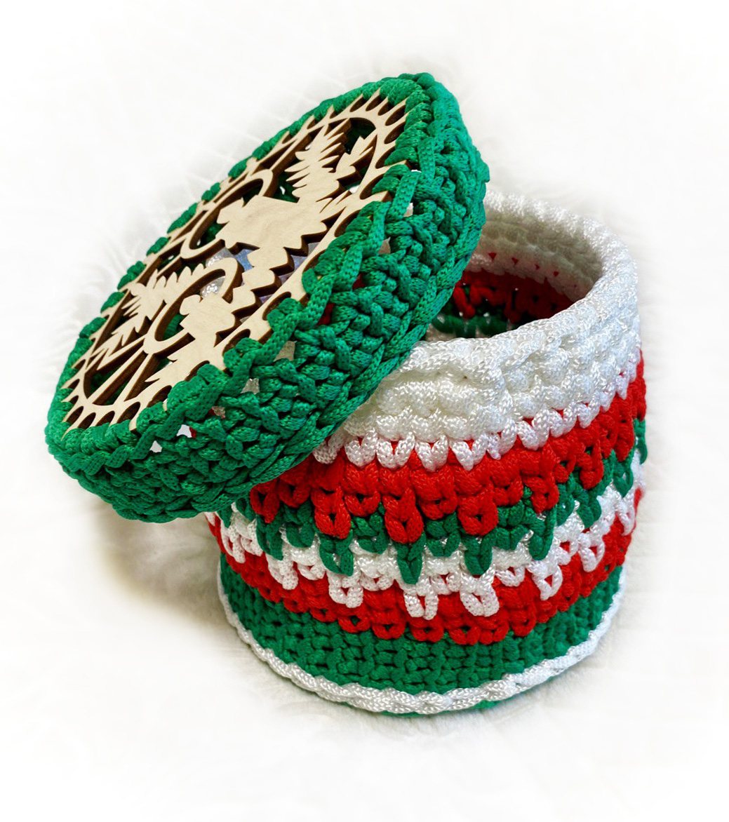 Шкатулка "Рождество" выполнена из трикотажной нити , шириной 7мм. В этот волшебный период, когда воздух наполнялся ароматом пряников и мандаринов, сердца людей наполнялись радостью, надеждой и желанием подарить всем вокруг счастье и любовь, самое время задуматься о подарке. в шкатулочку можно положить любую мелочь, сладости, записочки. Донышко и крышка выполнены из плотной вязанной основы.