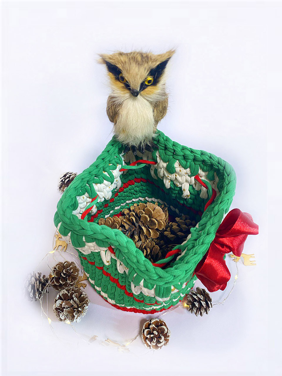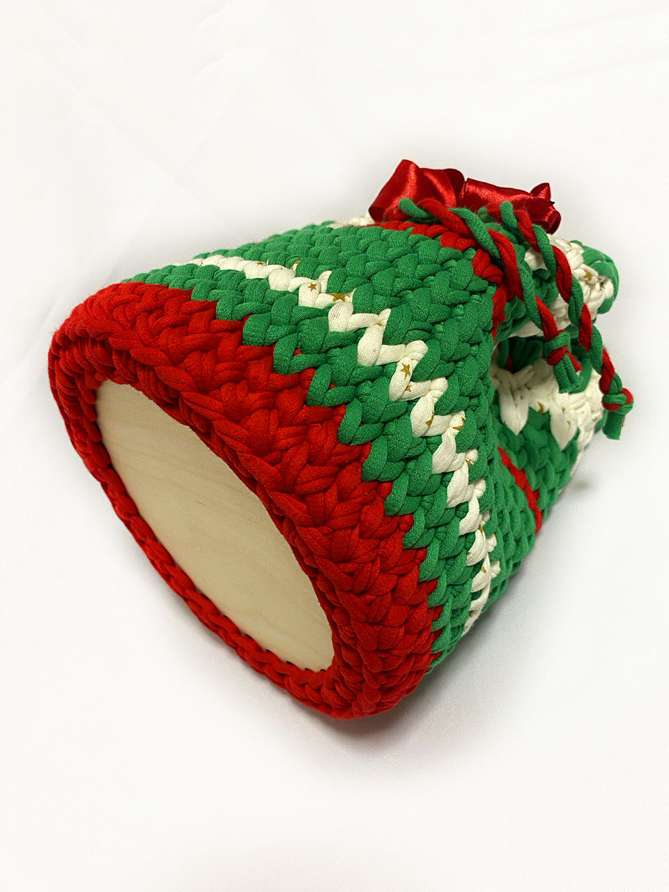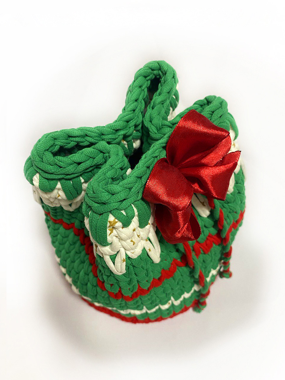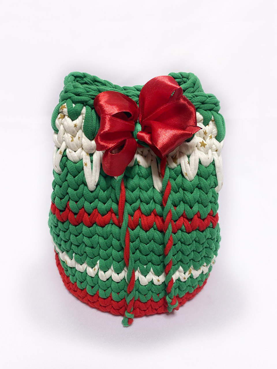 Шкатулка "Рождество" выполнена из трикотажной нити , шириной 7мм. Скоро Новый год. Время задуматься о подарке..В этот волшебный период воздух наполнялся ароматом пряников и мандаринов, сердца людей наполнялись радостью, надеждой и желанием подарить всем вокруг счастье и любовь. Шкатулочка стягивается на канатик и образует вид мешочка, в котором можно замечательно спрятать сюрприз Донышко - деревянная основа, замечательно держит форму.