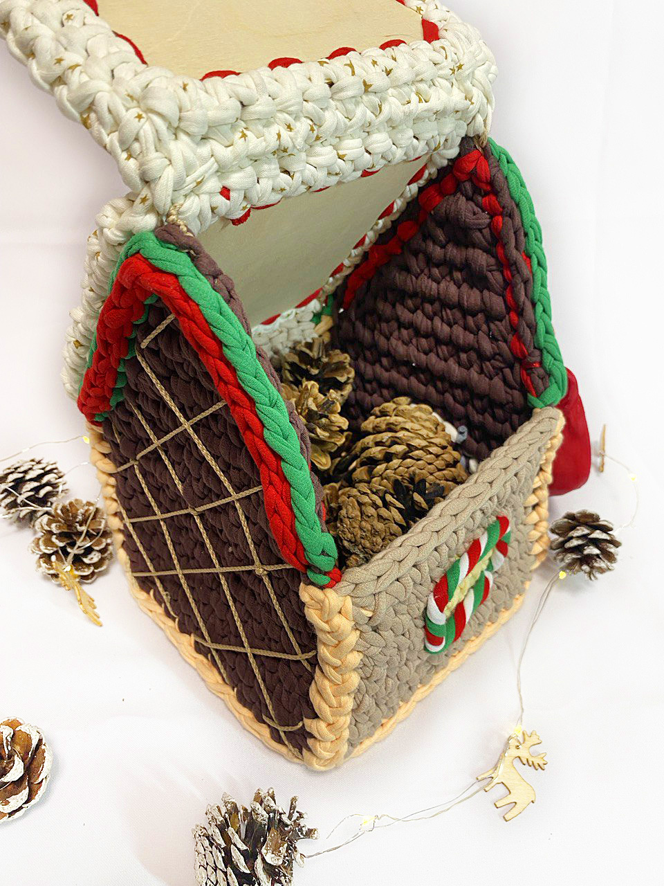 Шкатулка "Рождество" выполнена из трикотажной нити , шириной 7мм. В этот волшебный период, когда воздух наполнялся ароматом пряников и мандаринов, сердца людей наполнялись радостью, надеждой и желанием подарить всем вокруг счастье и любовь, самое время задуматься о подарке. в шкатулочку можно положить любую мелочь. Рукодельницы могут хранить нитки, иголки и многое другое. Домик красиво украсит интерьер в период празднования Нового Года и Рождества. Порадует близких своим сказочным очарованием. Донышко и крышка выполнены из деревянной основы.