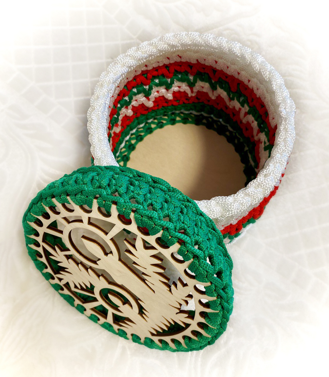 Шкатулка "Рождество" выполнена из полиэфирного шнура, шириной 5мм. В этот волшебный период, когда воздух наполнялся ароматом пряников и мандаринов, сердца людей наполнялись радостью, надеждой и желанием подарить всем вокруг счастье и любовь, самое время задуматься о подарке. в шкатулочку можно положить любую мелочь, сладости, записочки. Донышко и крышка выполнены из деревянной основы.