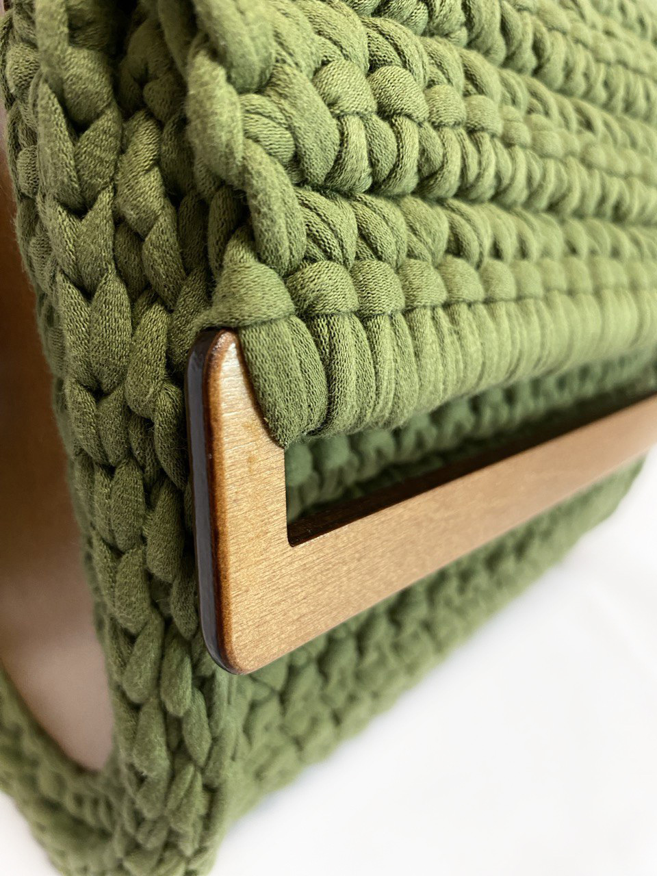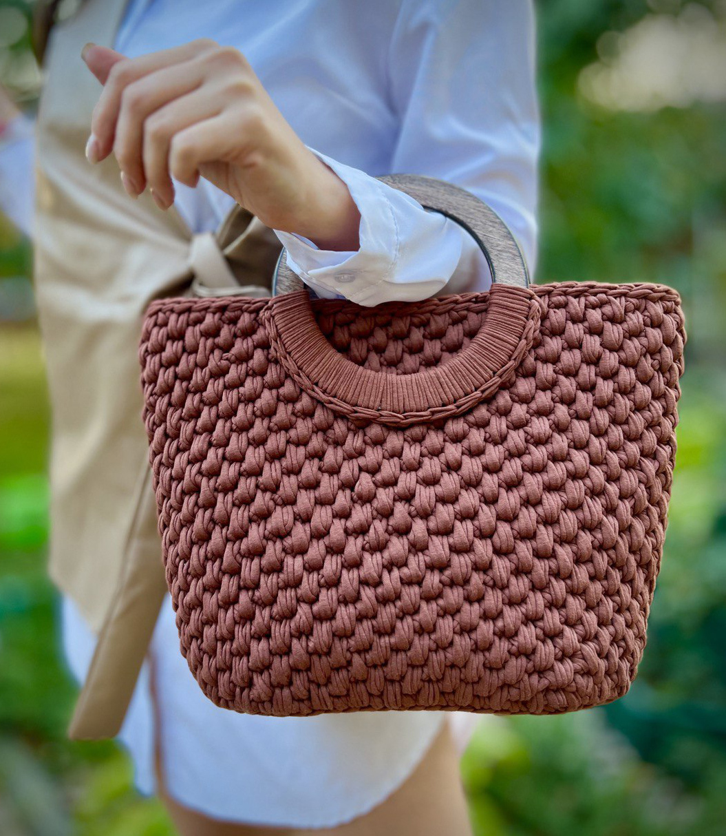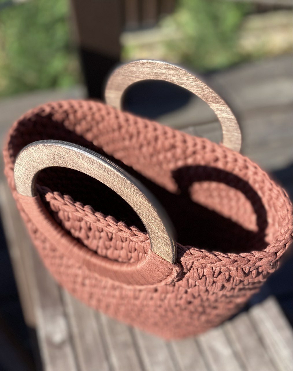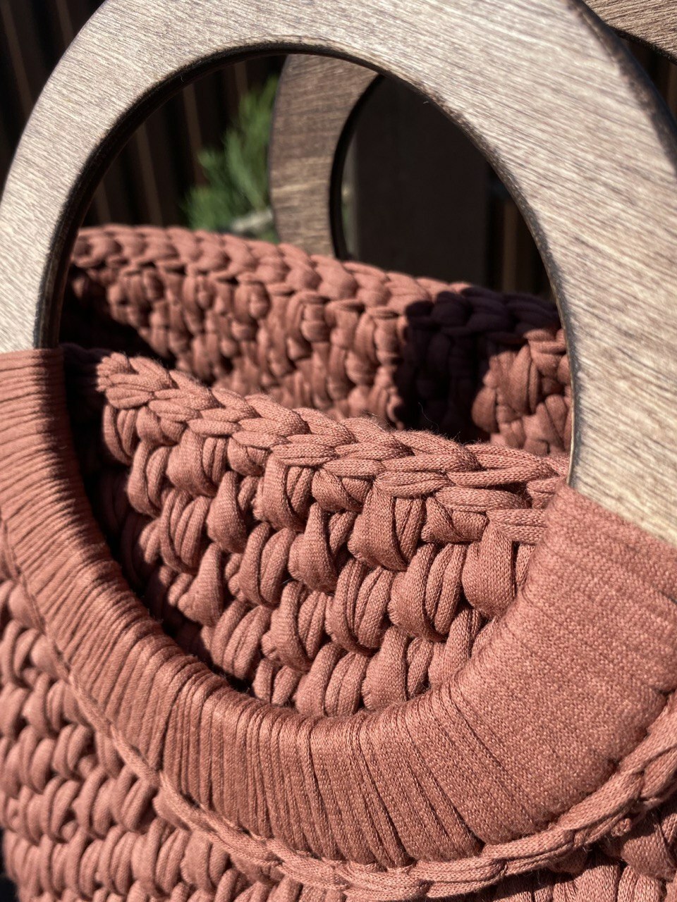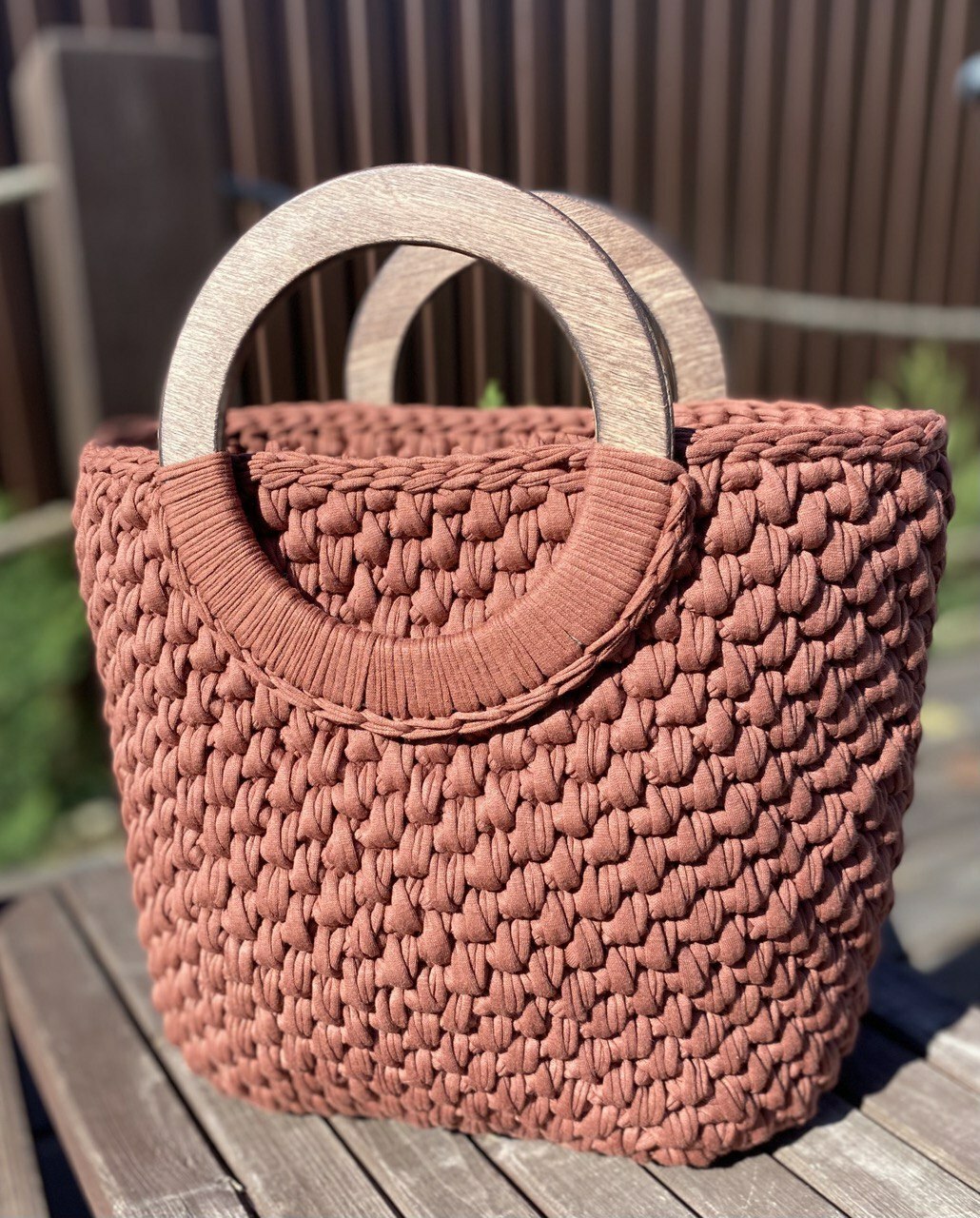 Сумка выполнена из Трикотажной нити толщиной 7мм. Размеры готовой сумки 26смх13см, высота - 22см. Имеет 2 кармашка Фурнитура натуральное дерево под лак