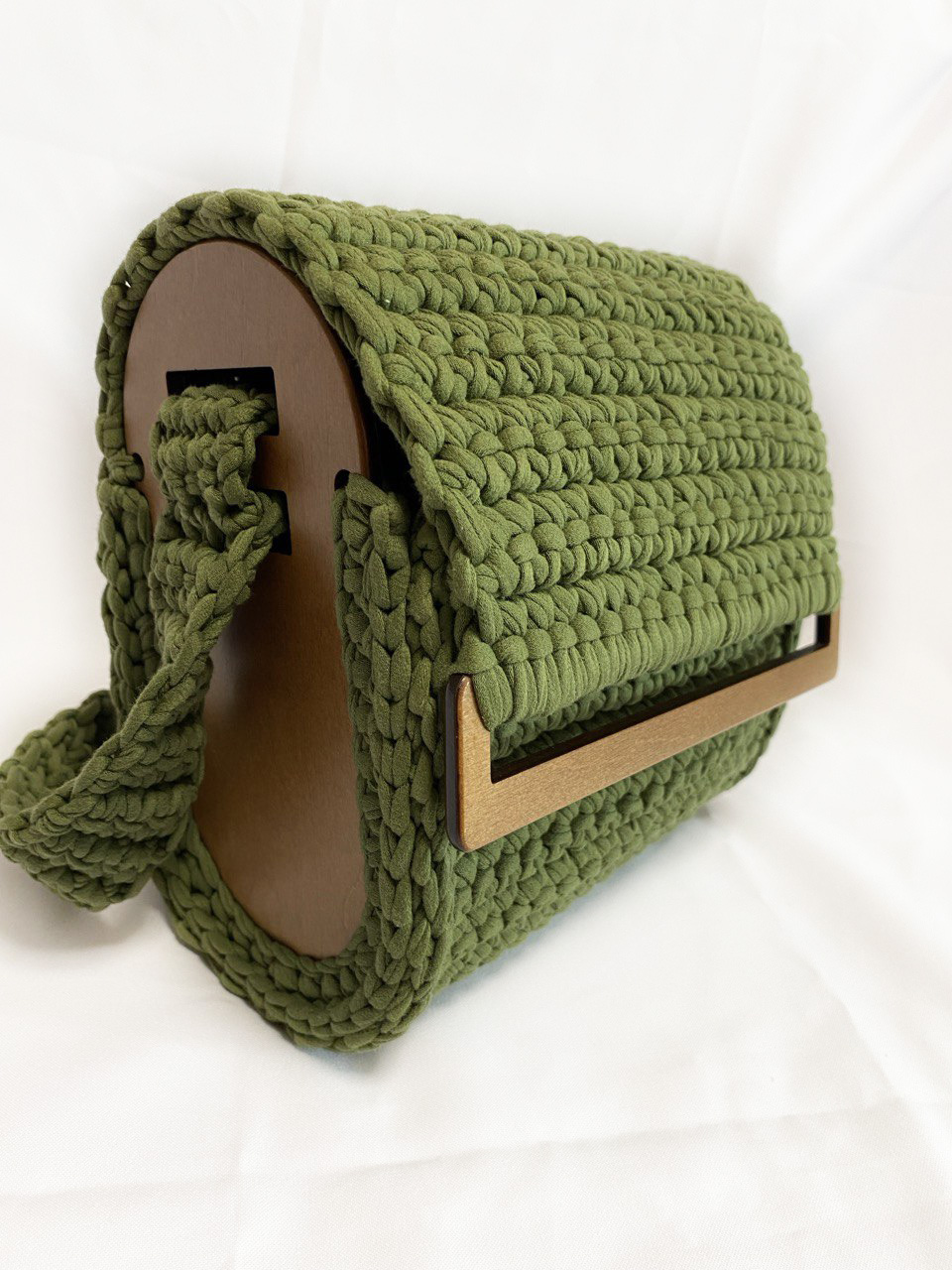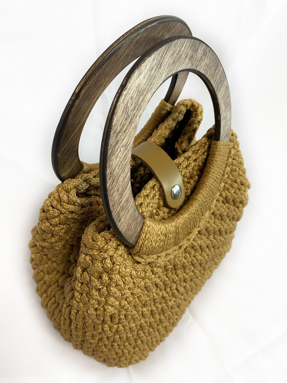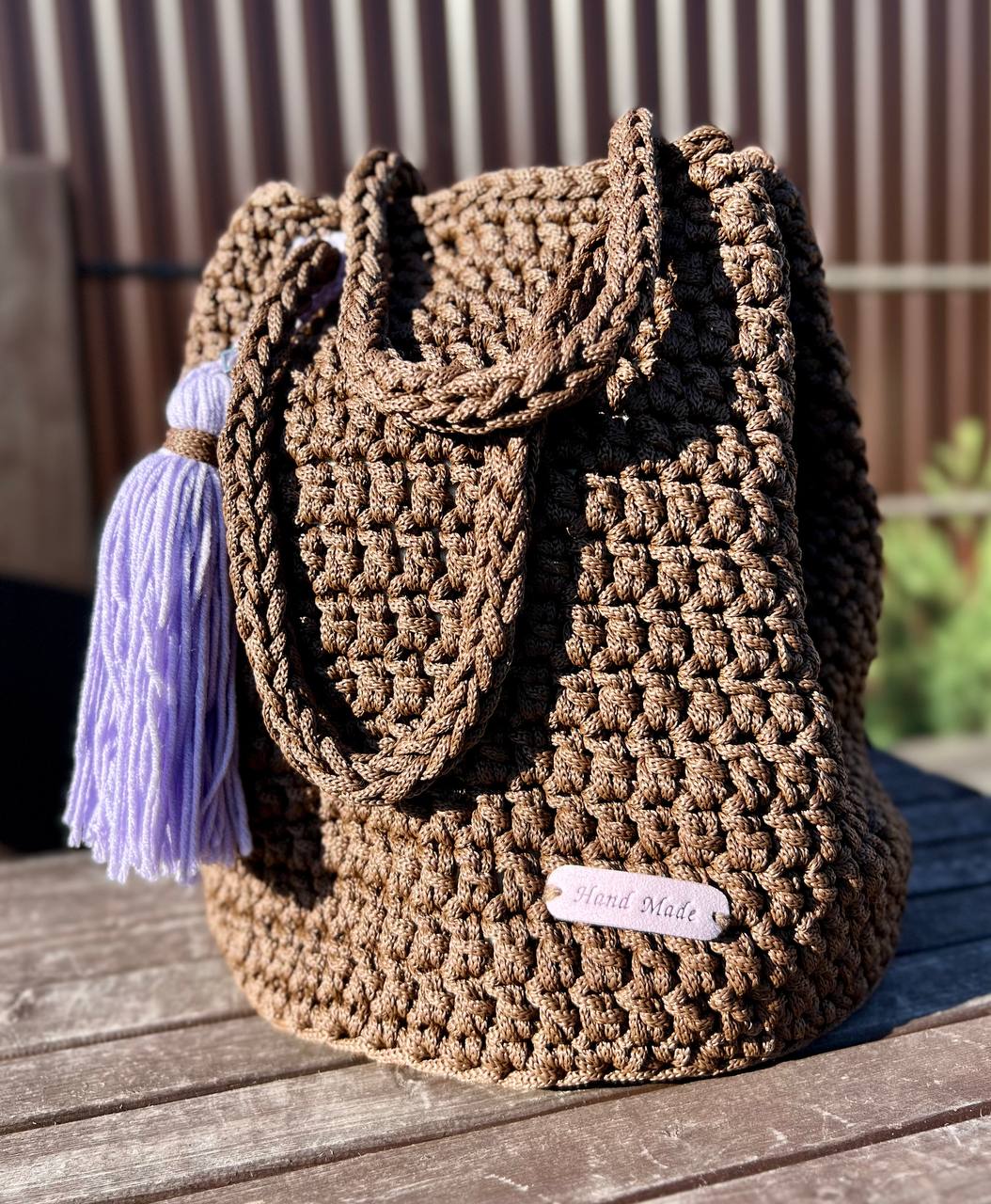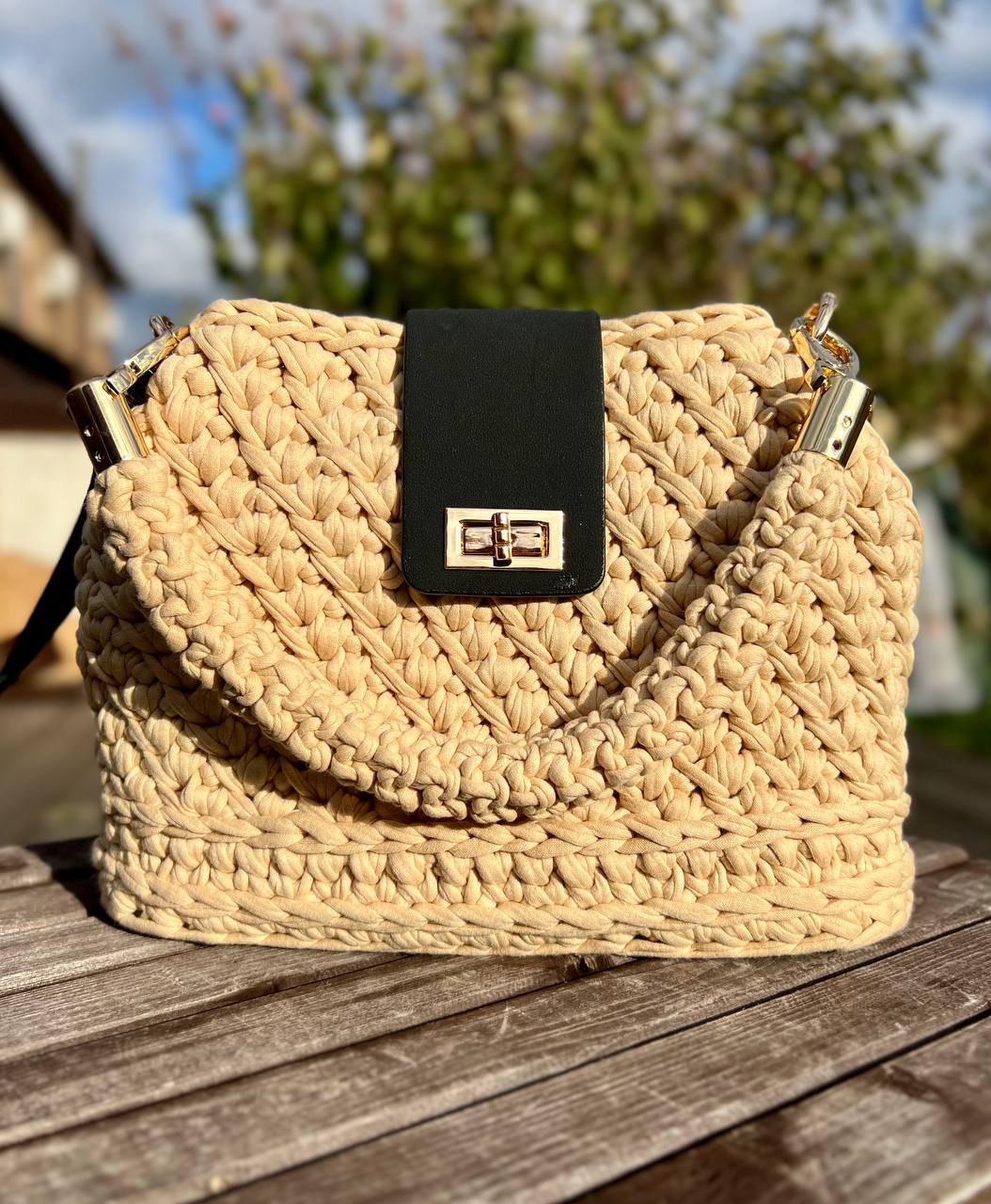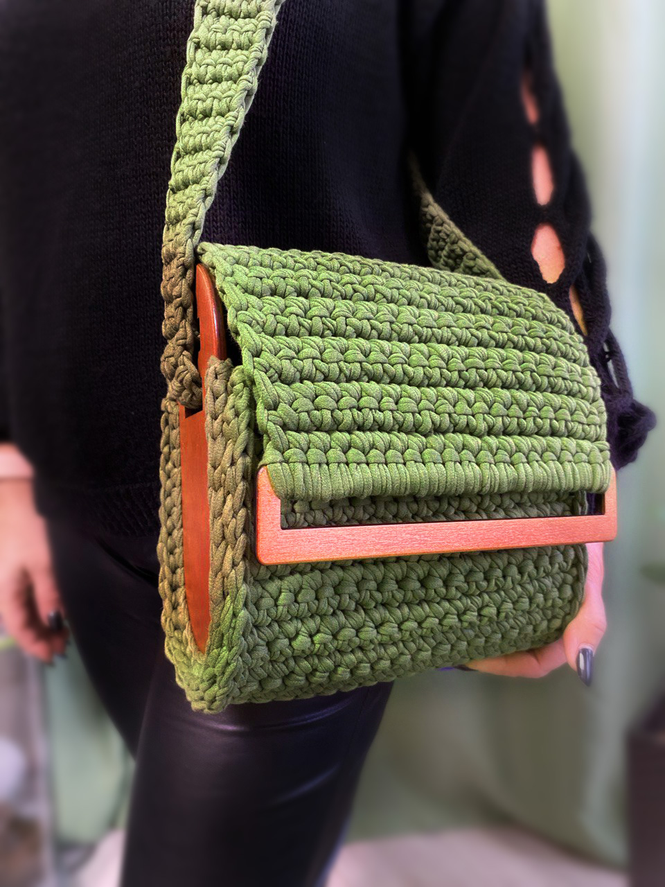 Сумка выполнена из Трикотажной нити толщиной 7мм. Размеры готовой сумки 26смх13см, высота - 22см. Имеет 2 кармашка Фурнитура натуральное дерево под лак