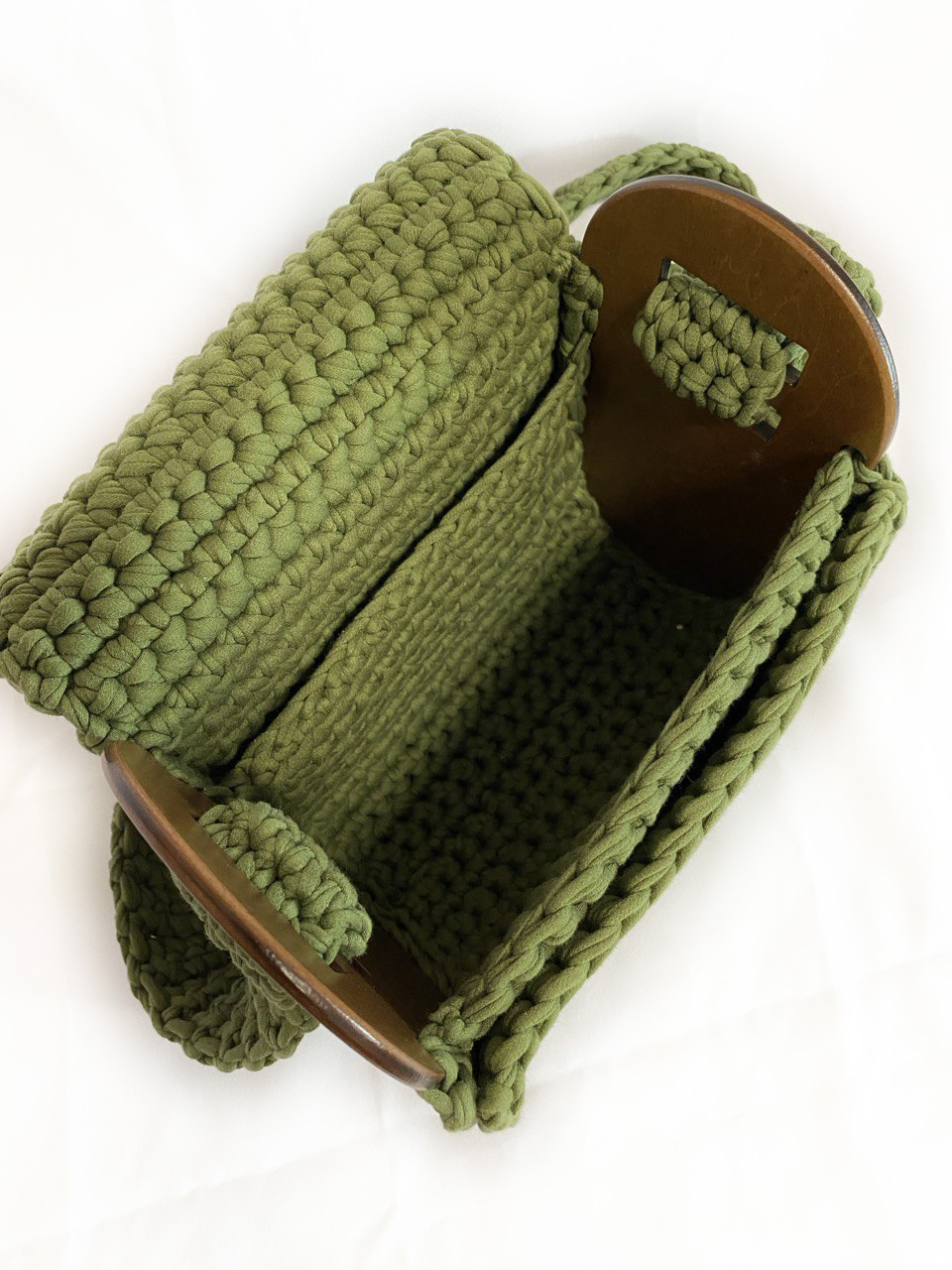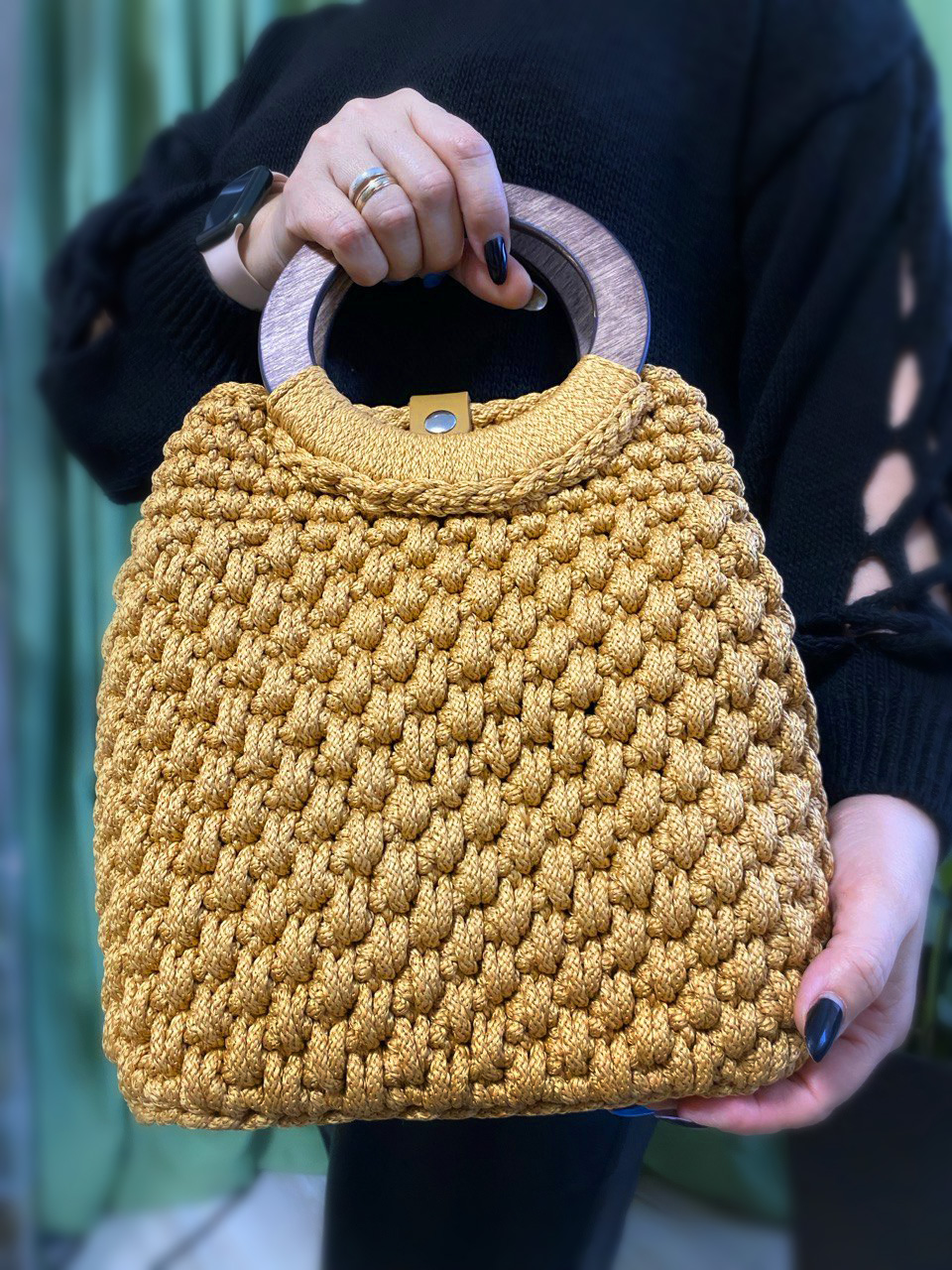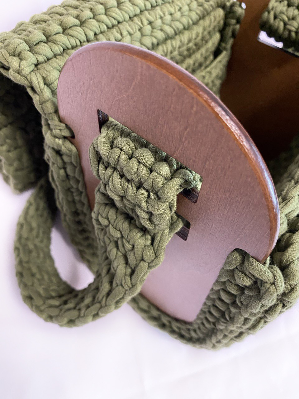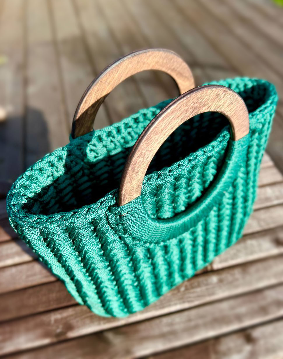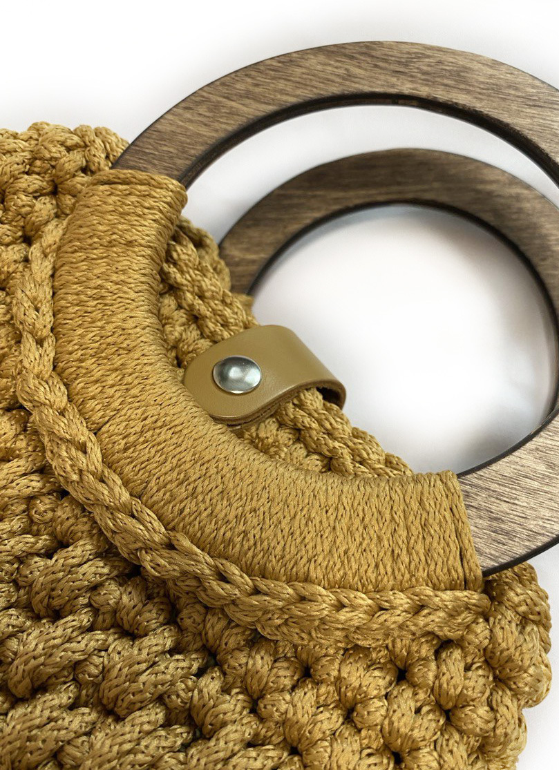 Сумка выполнена из Трикотажной нити толщиной 7мм. Размеры готовой сумки 26смх13см, высота - 22см. Имеет 2 кармашка Фурнитура натуральное дерево под лак