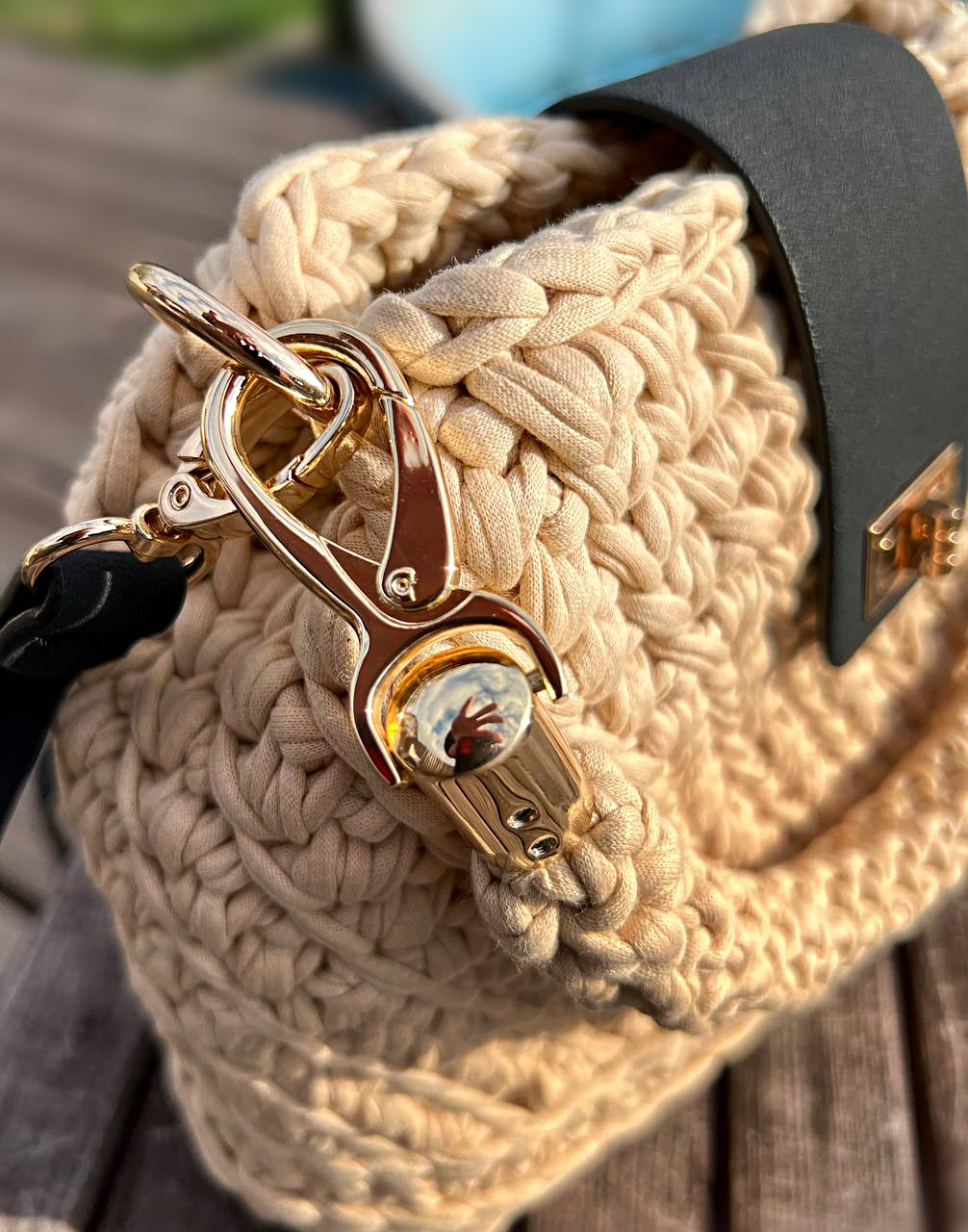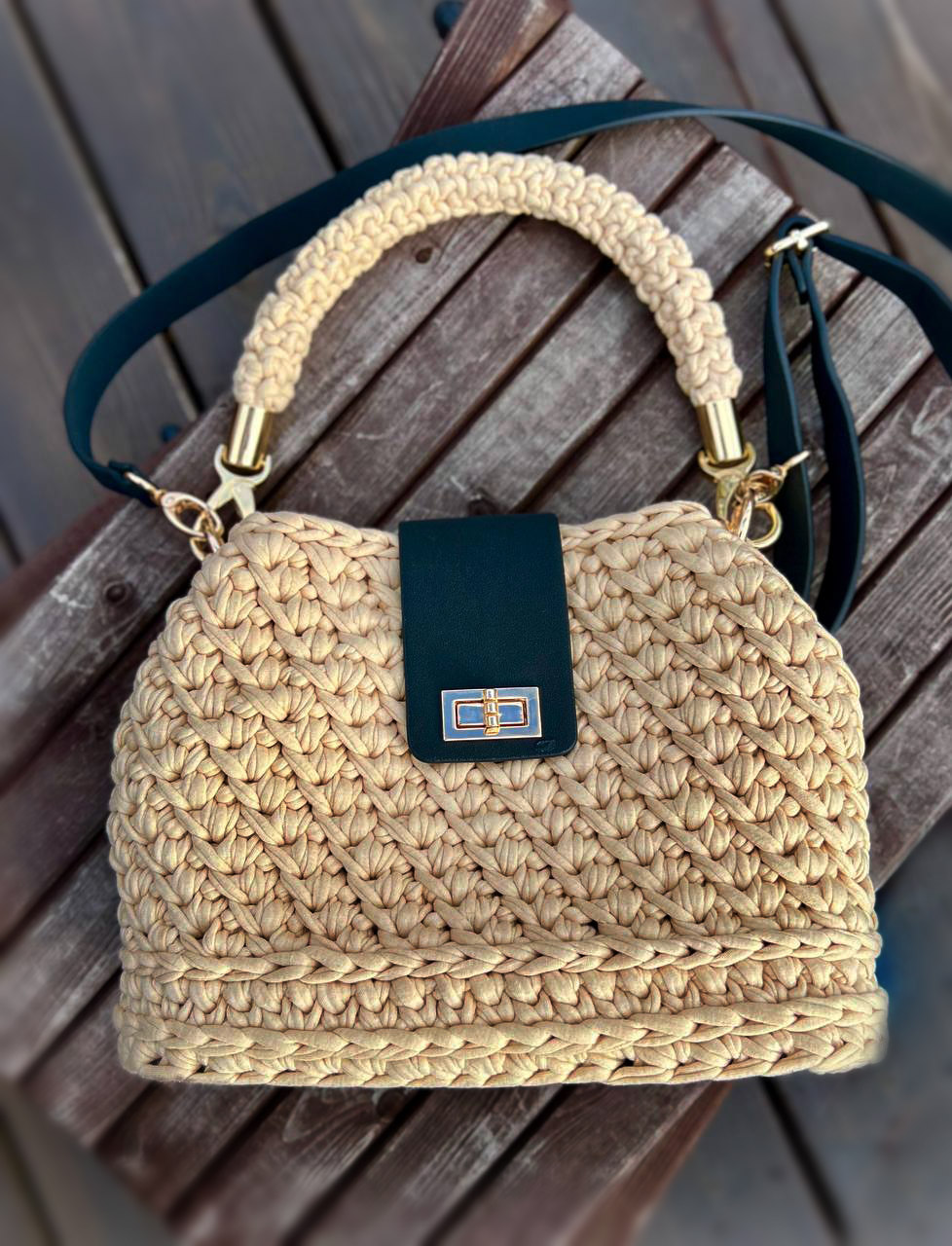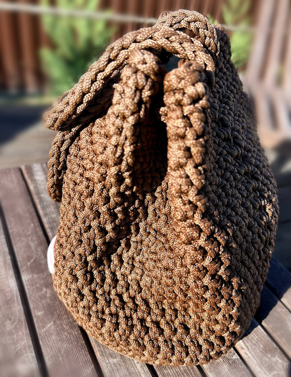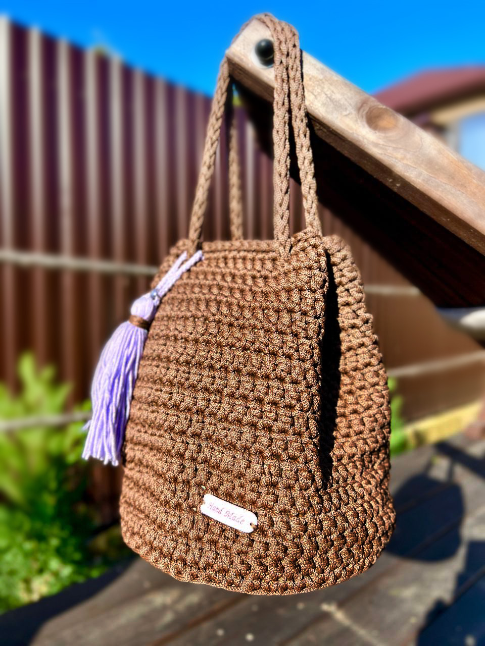 Сумочка "Бьюти" выполнена из полиэфирного шнура толщиной 3 мм. ширина - 28 см, ширина дна - 8 см, ширина ручки - 3,5 см, высота корпуса - 14 см, высота с ручкой - 32 см, длинна ручки = 25 см. Декоративная застежка. Цвет шнура любой на вкус заказчика.
