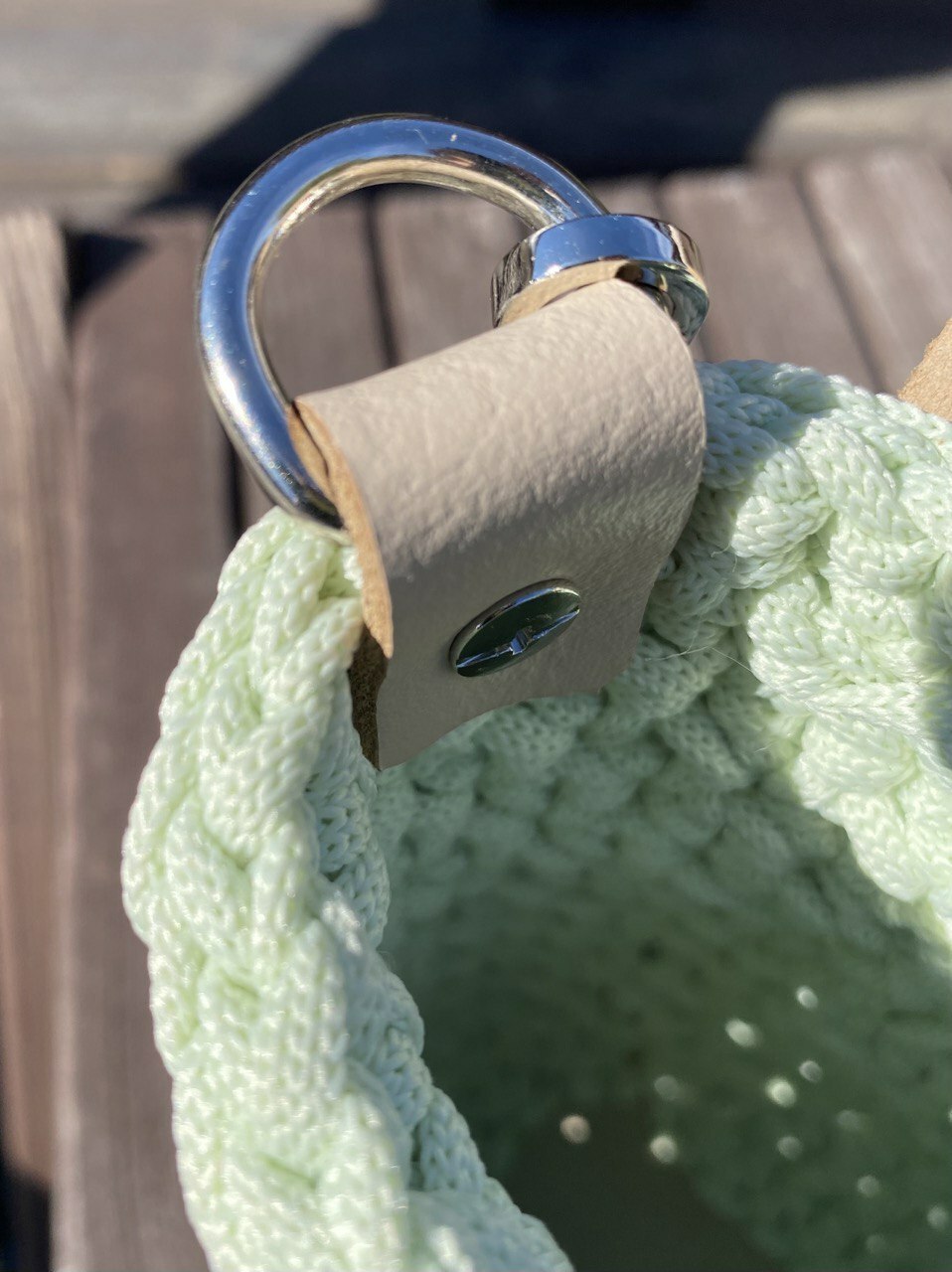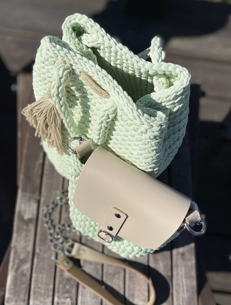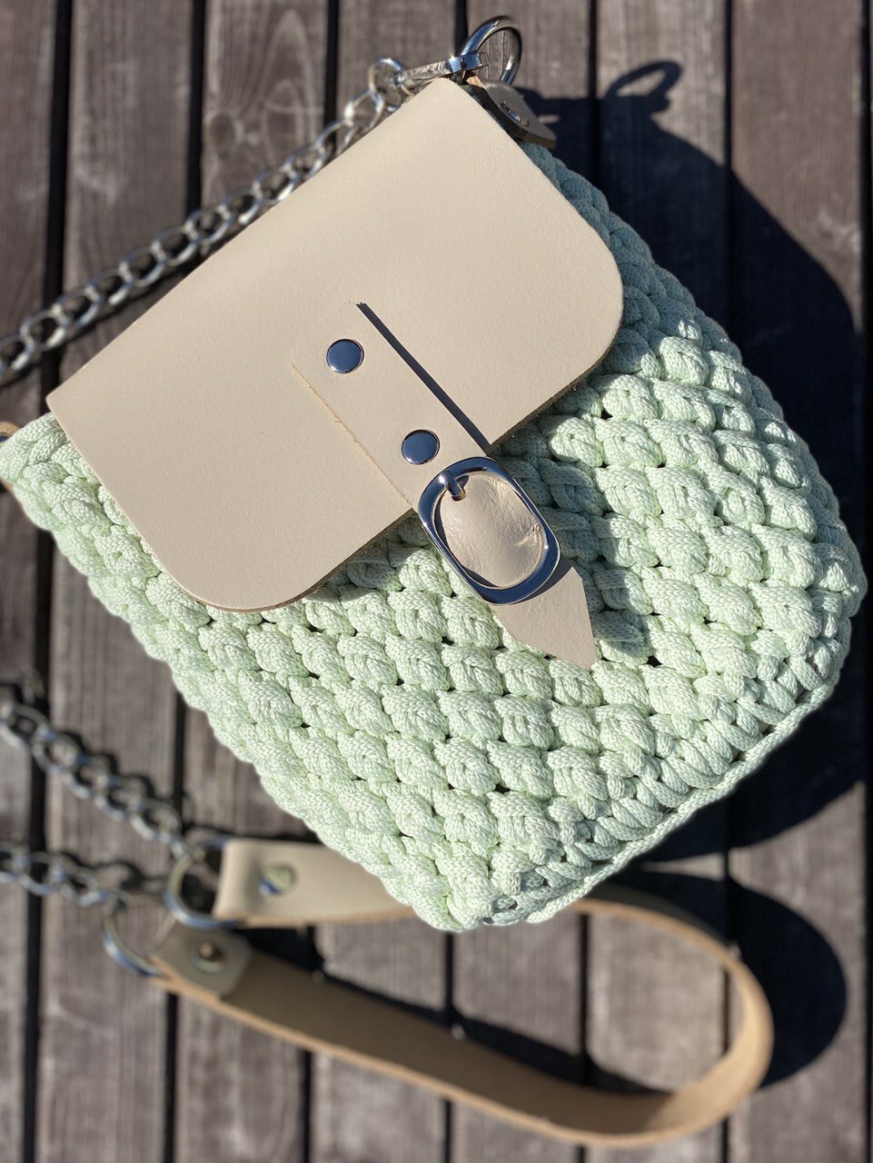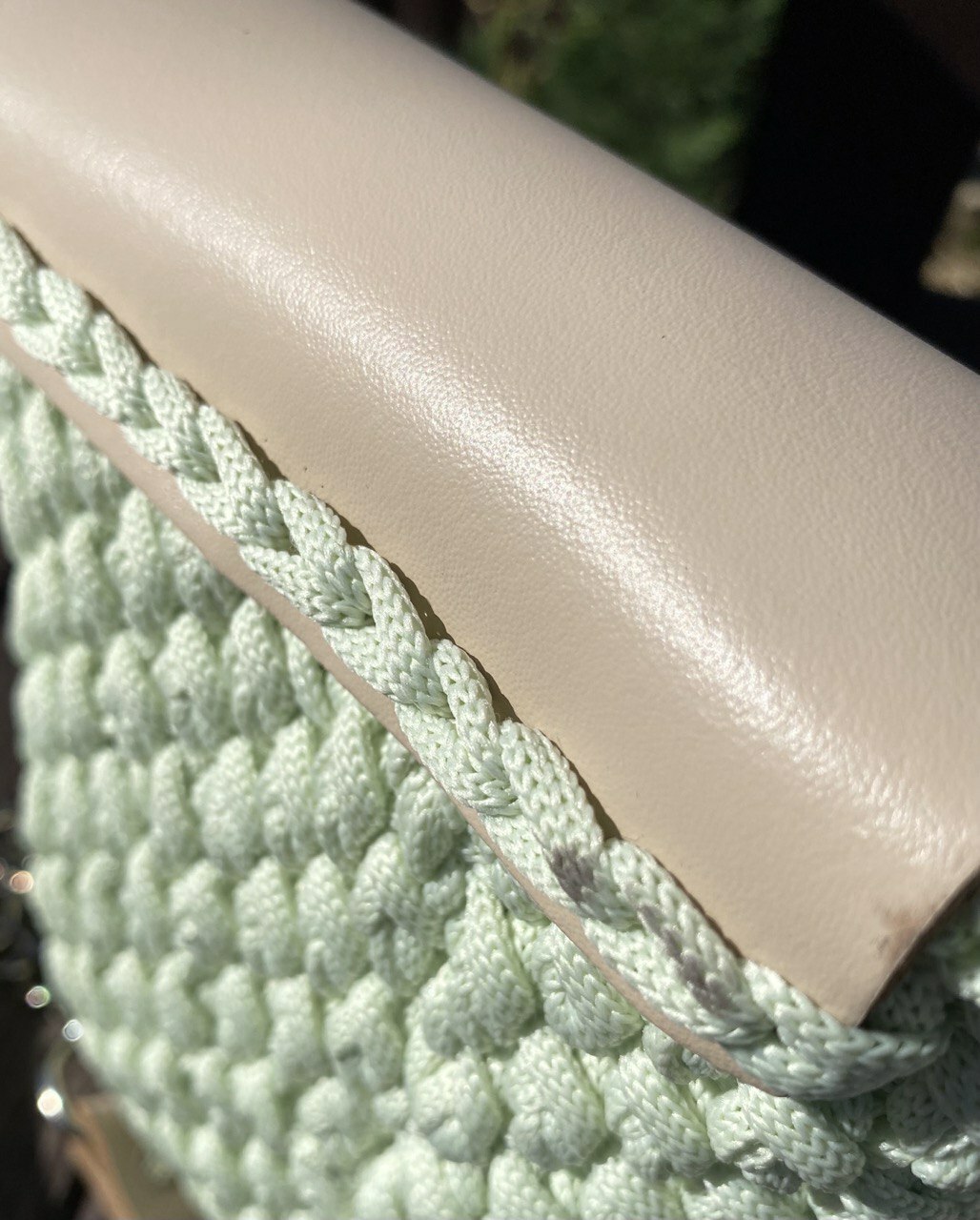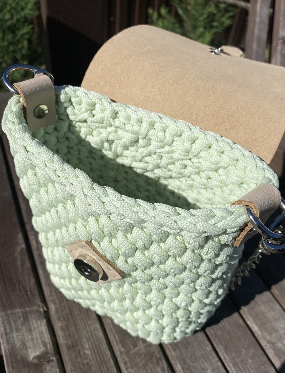 Мини сумочка выполнена из полиэфирного шнура толщиной 5мм. Шнур плотный, крупный, износостойкий, не выгорает на солнце. Фурнитура (клапан, донышко и ремешок) из натуральной кожи. Цвет "Фисташка"