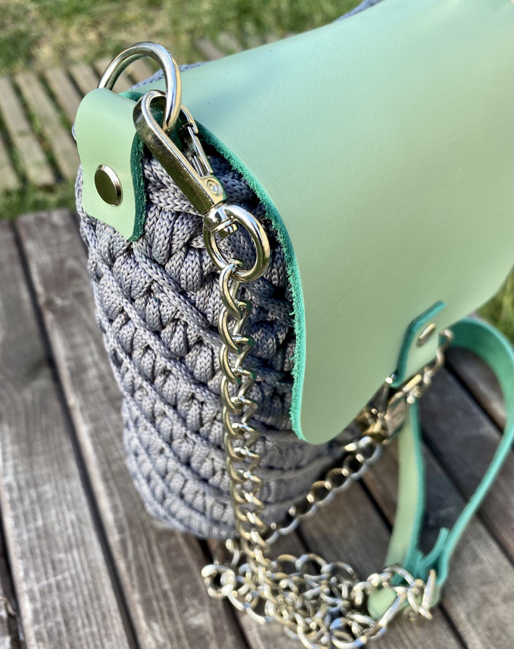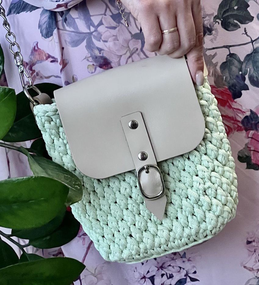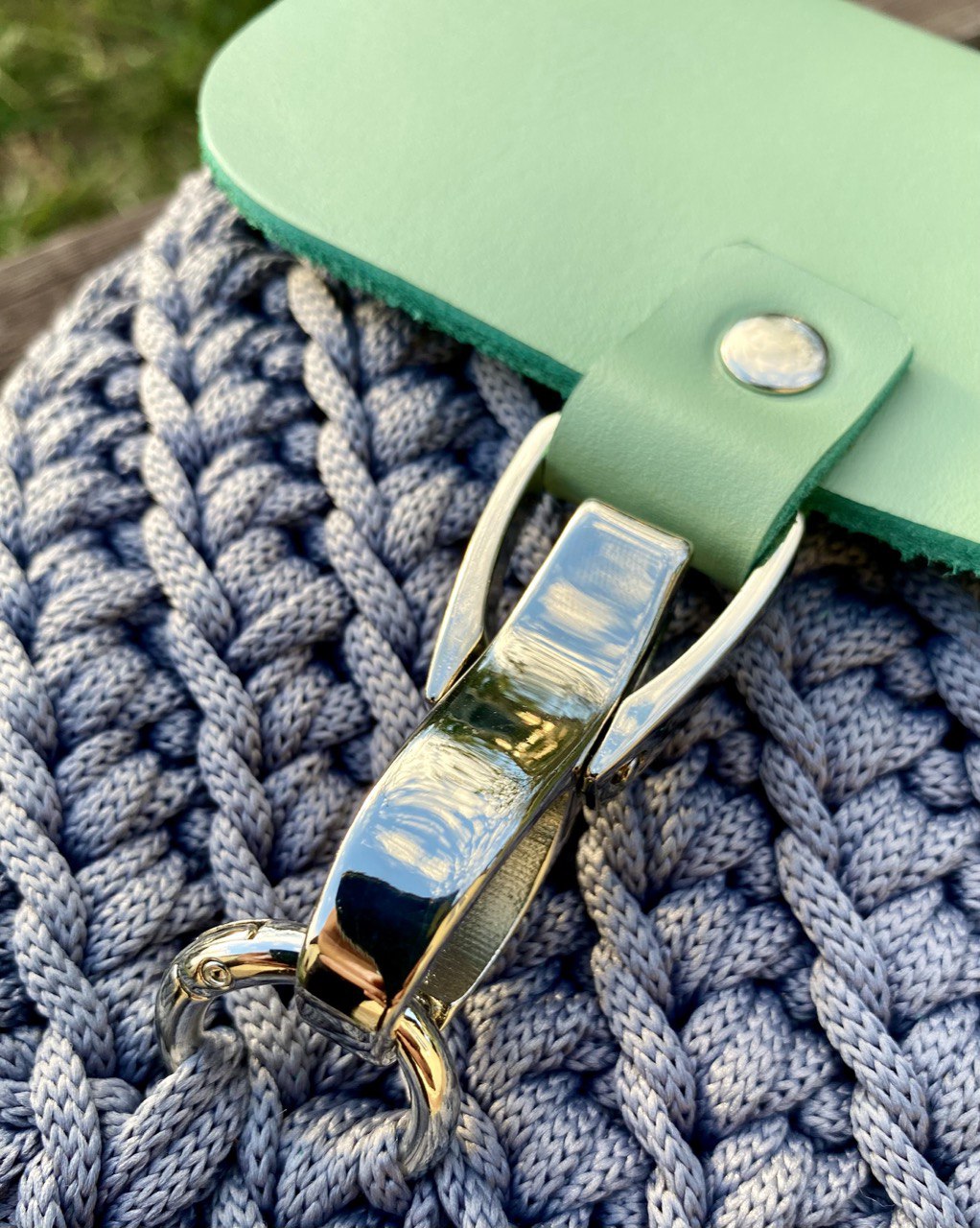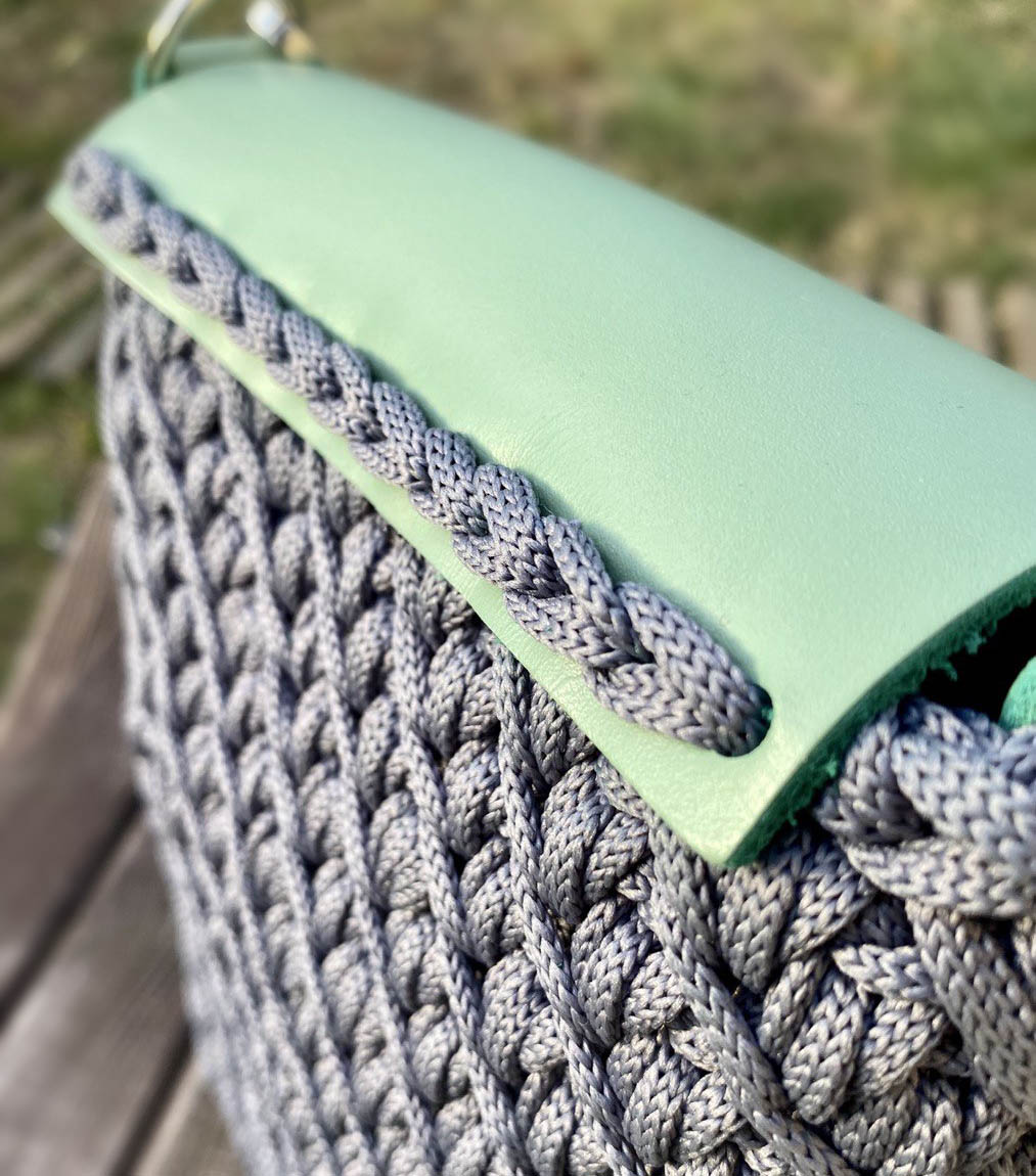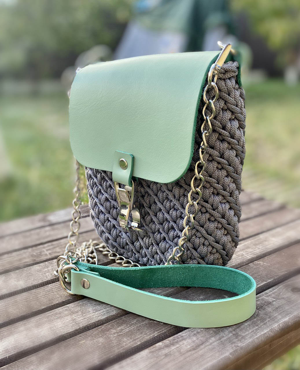 Мини сумочка выполнена из полиэфирного шнура толщиной 5мм. Шнур плотный, крупный, износостойкий, не выгорает на солнце. Фурнитура (клапан, донышко и ремешок) из натуральной кожи. Цвет "Фисташка"