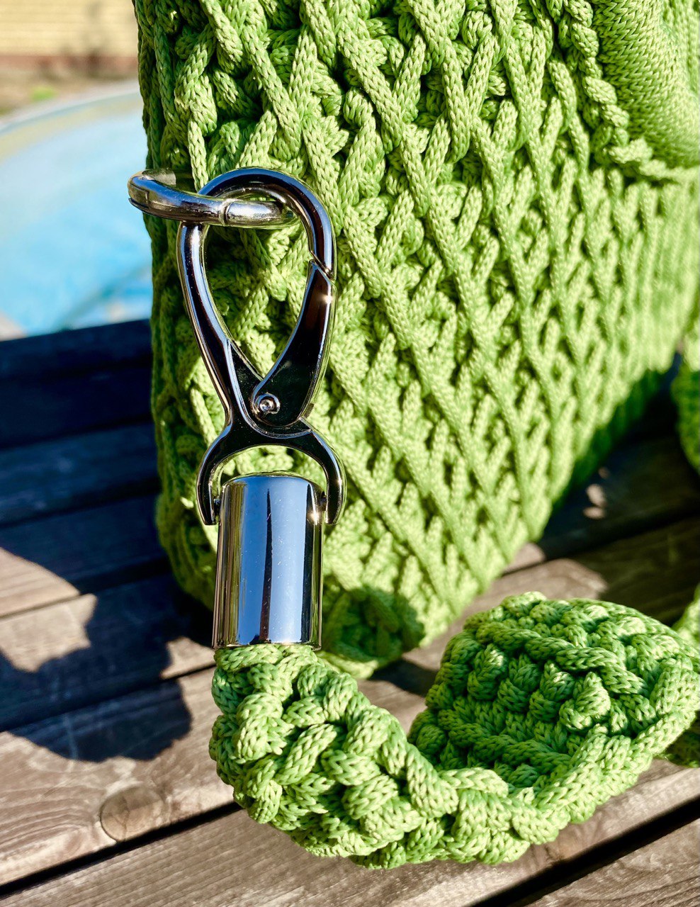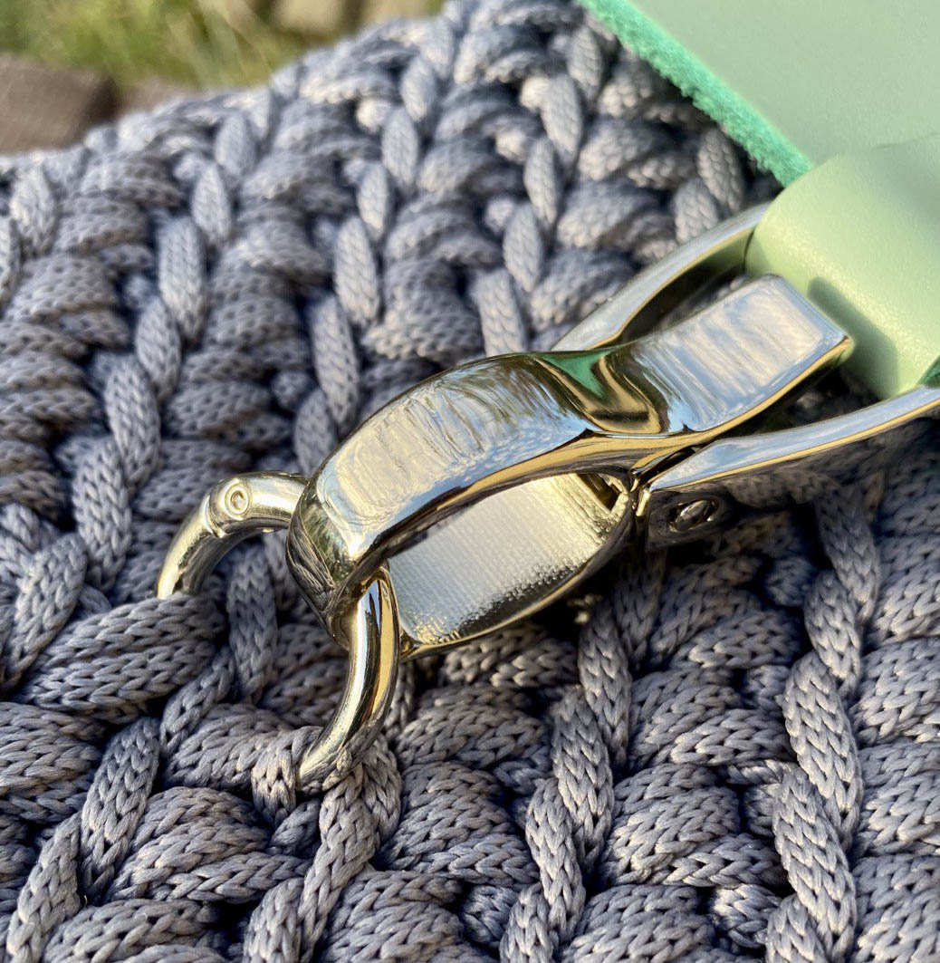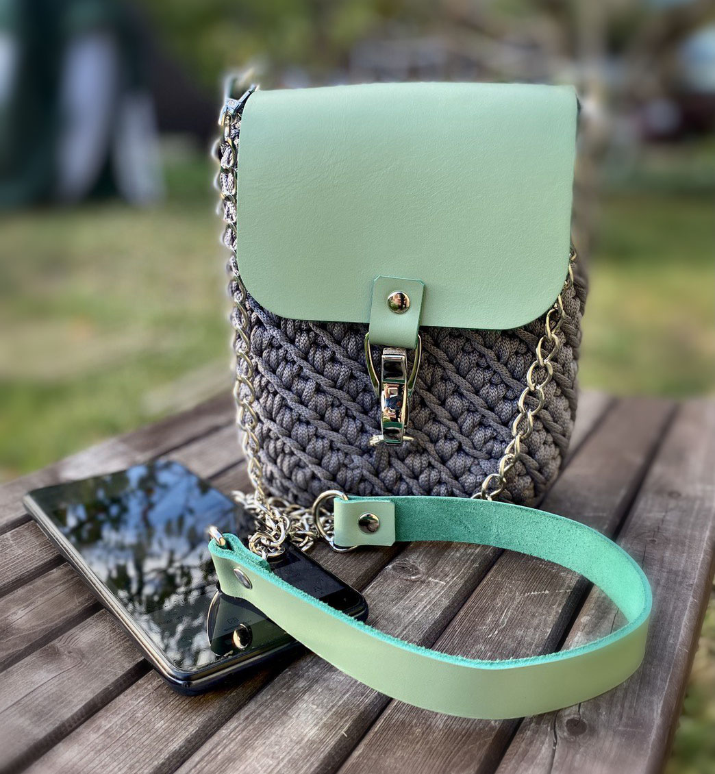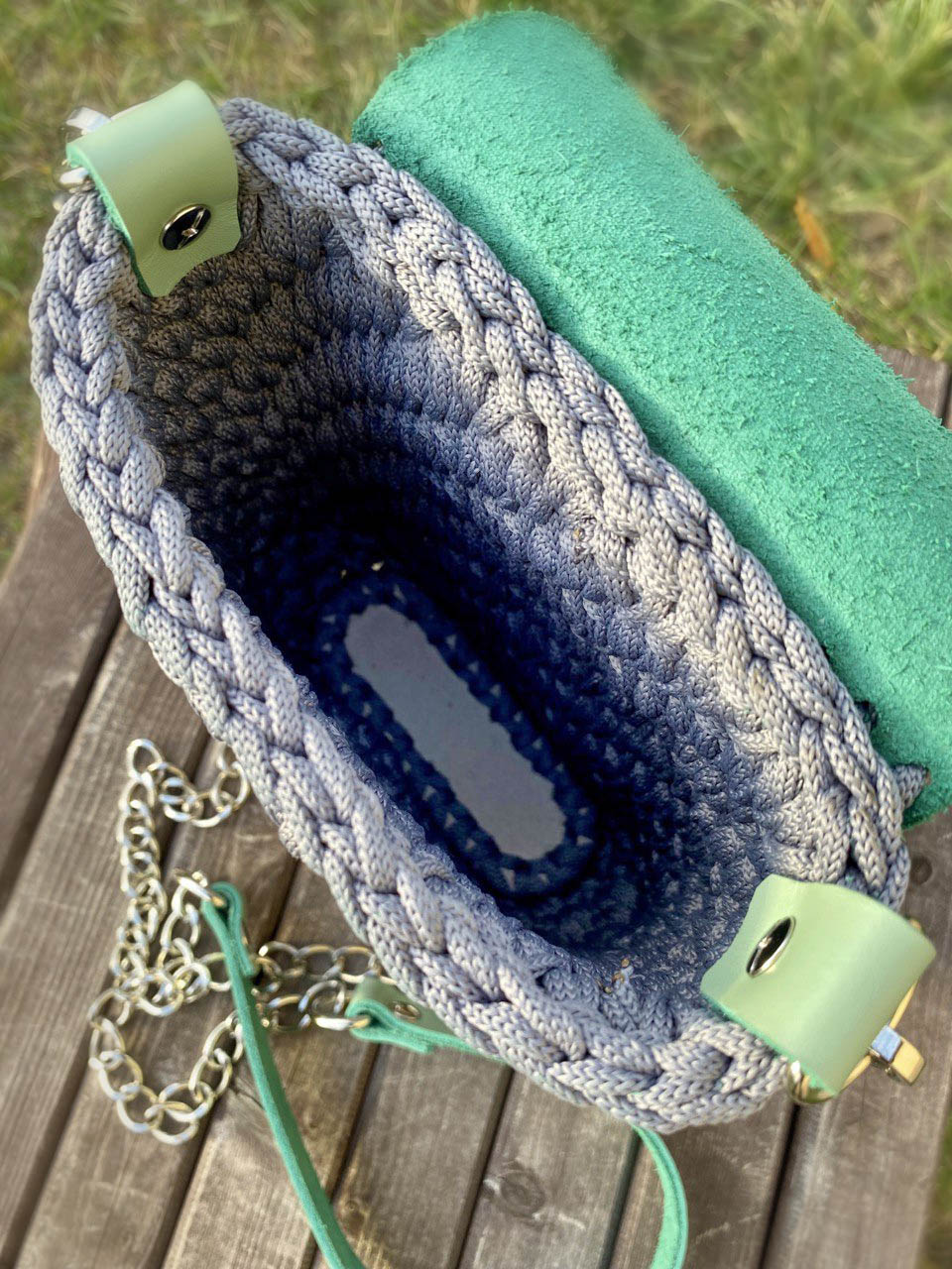 Мини сумочка выполнена из полиэфирного шнура толщиной 5мм. Шнур плотный, крупный, износостойкий, не выгорает на солнце. Фурнитура (клапан, донышко и ремешок) из натуральной кожи. Цвет "Фисташка"