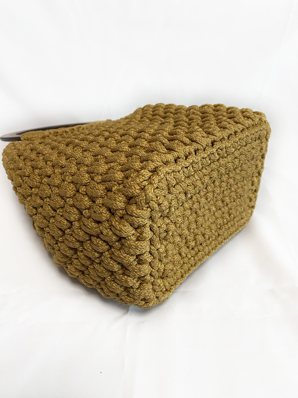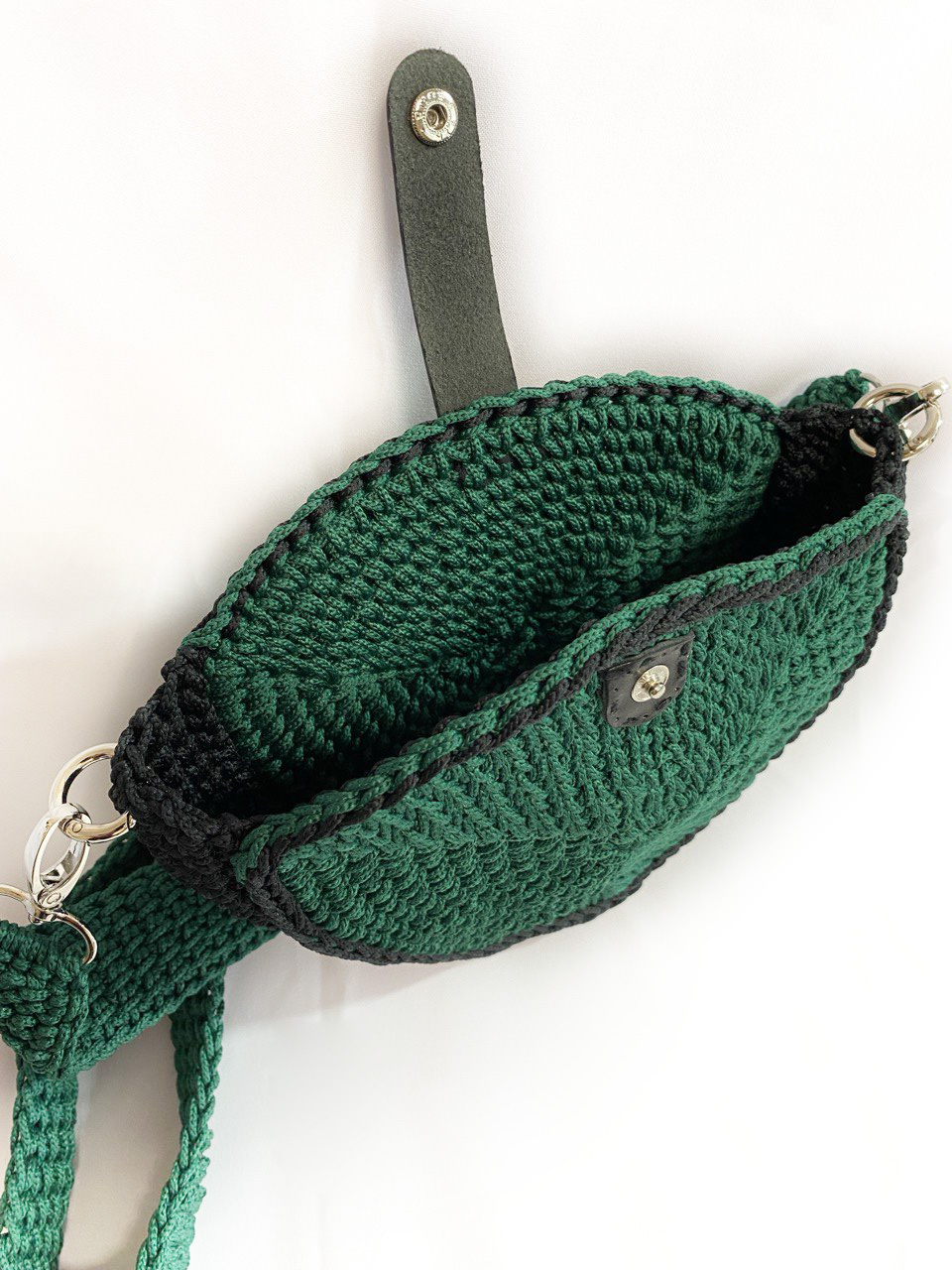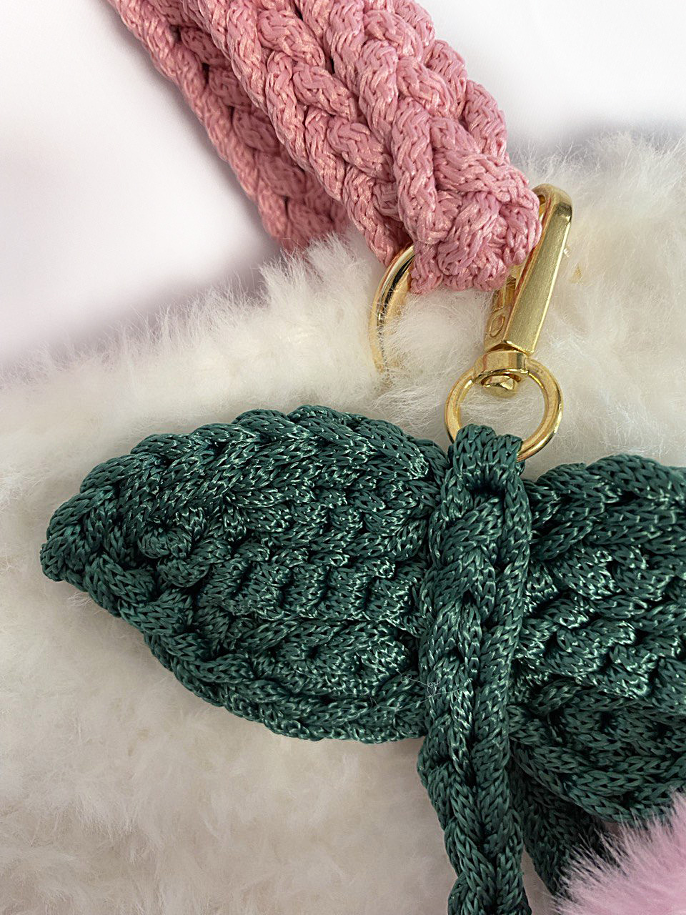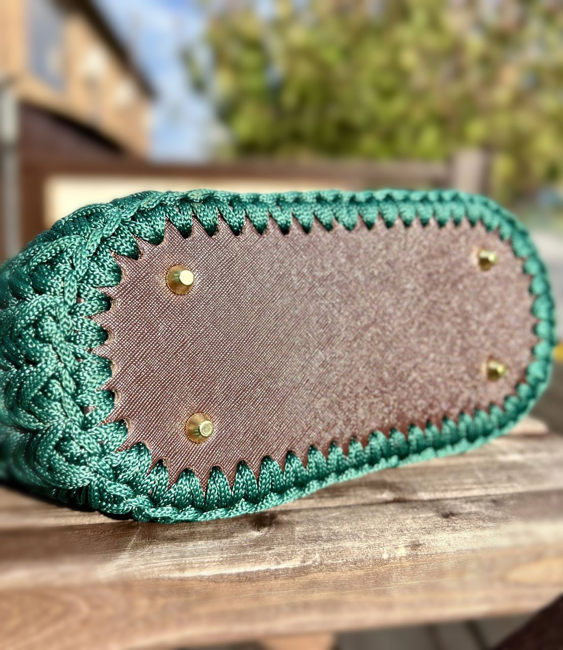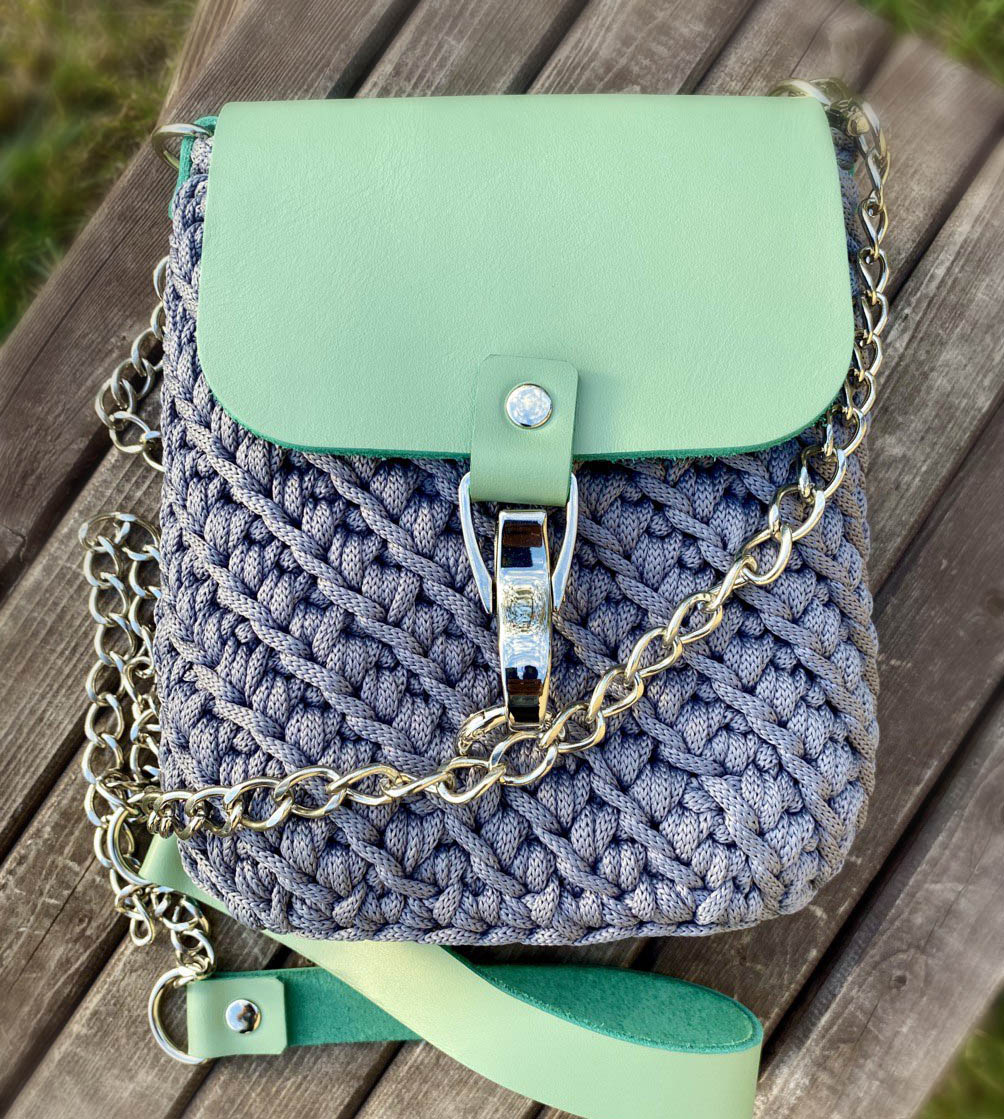 Мини сумочка выполнена из полиэфирного шнура толщиной 5мм. Шнур плотный, крупный, износостойкий, не выгорает на солнце. Фурнитура (клапан, донышко и ремешок) из натуральной кожи. Цвет "Фисташка"