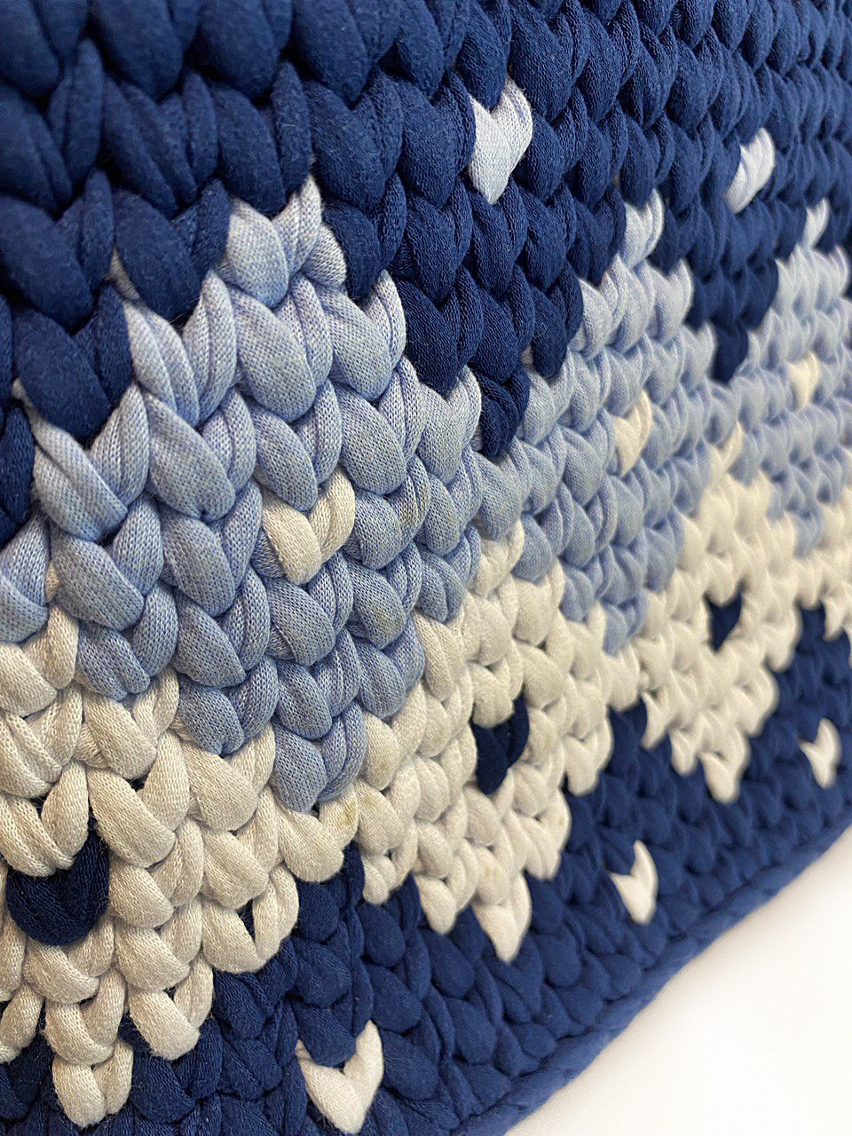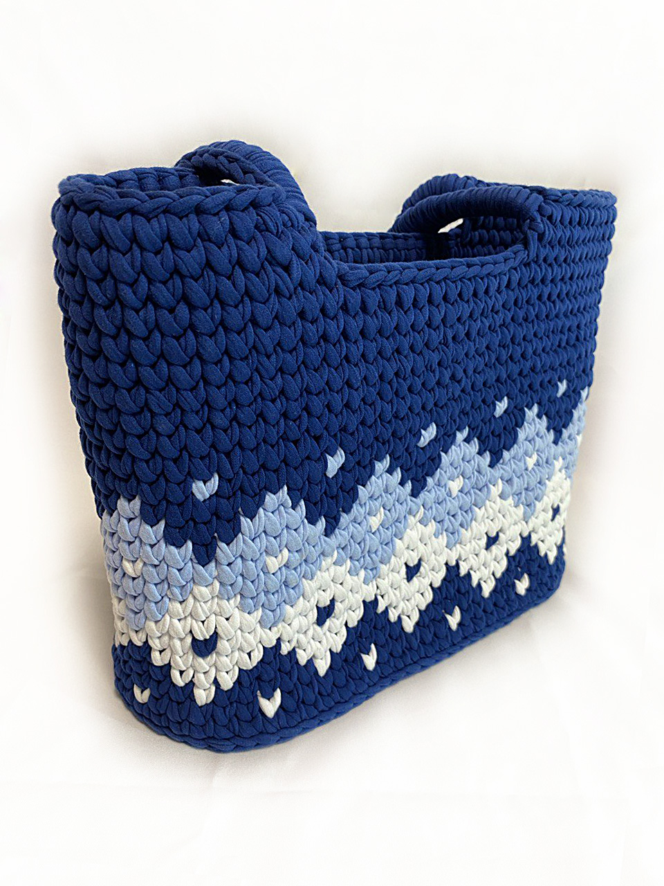 Выполнена из полиэфирного шнура толщиной 5 мм. Использовано 5 цветов. Под заказ количество и гамма подбираются индивидуально. Размеры готовой сумки 33х24х17. Большая, удобная, вместительная. Красивая. имеет кожаное дно, магнитная застежка. ручка - полиэфирный шнур.