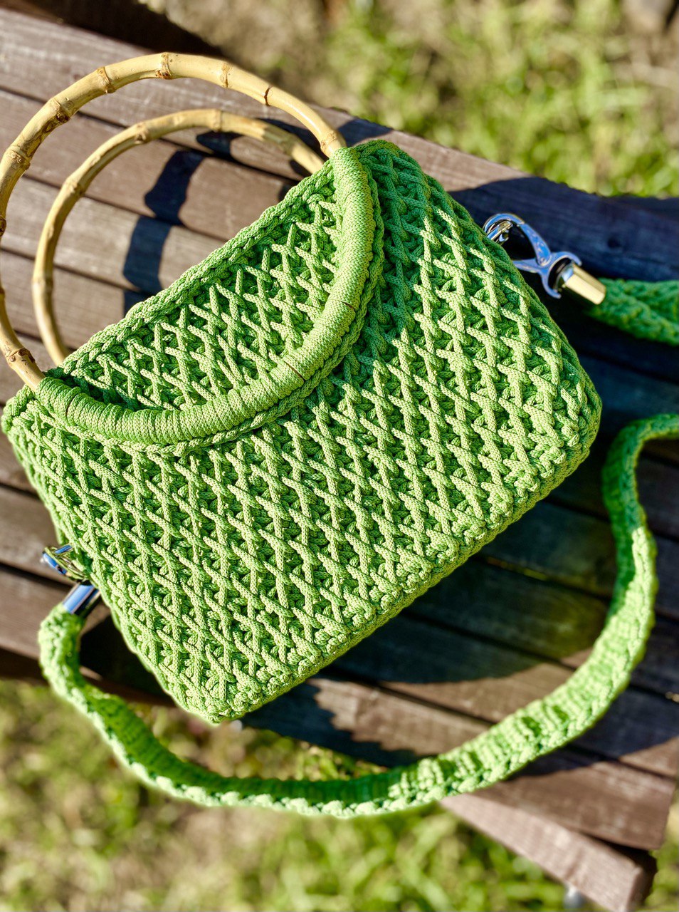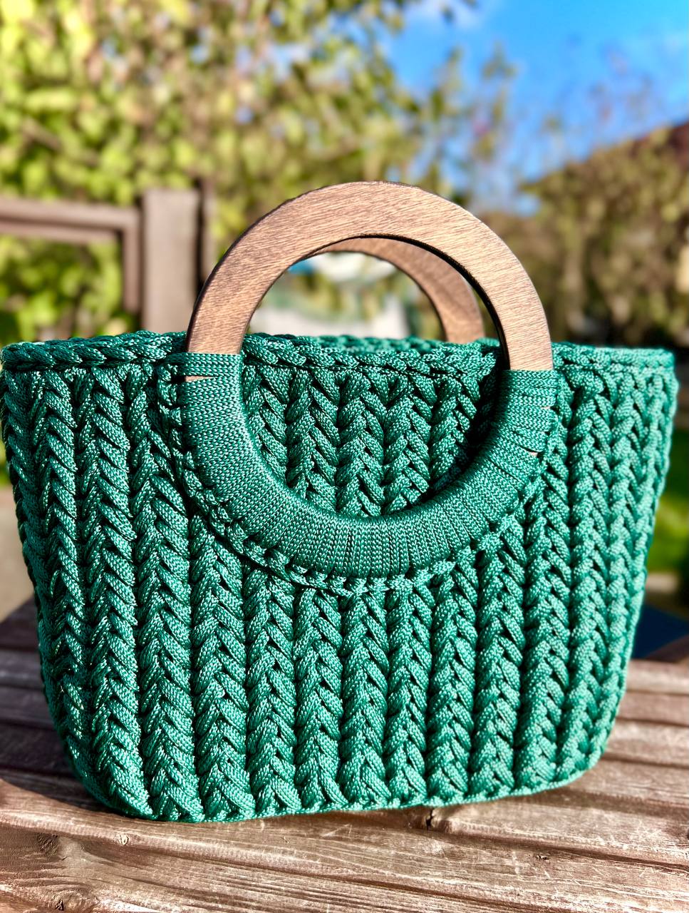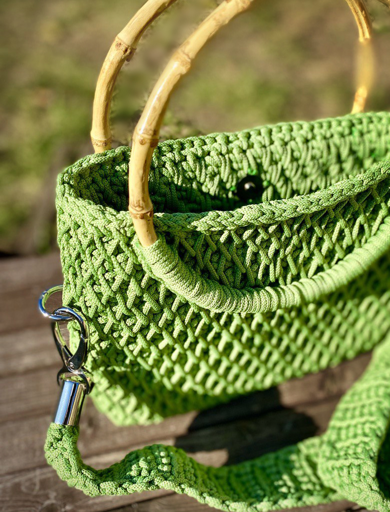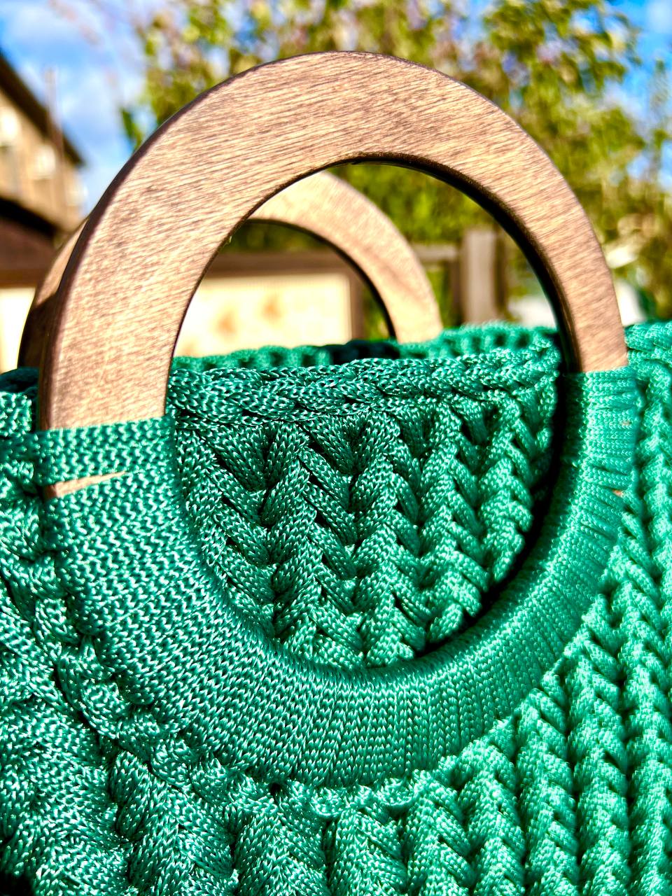 Сумочка "Соты-1" выполнены из полиэфирного шнура толщиной 3мм. Шнур плотный, износостойкий, не выгорает на солнце. Сумка очень элегантная, легкая, вместительная, модная. Бамбуковые ручки диаметр 16 см Цвет "Сочная трава" Под заказ цвет по желанию заказчика