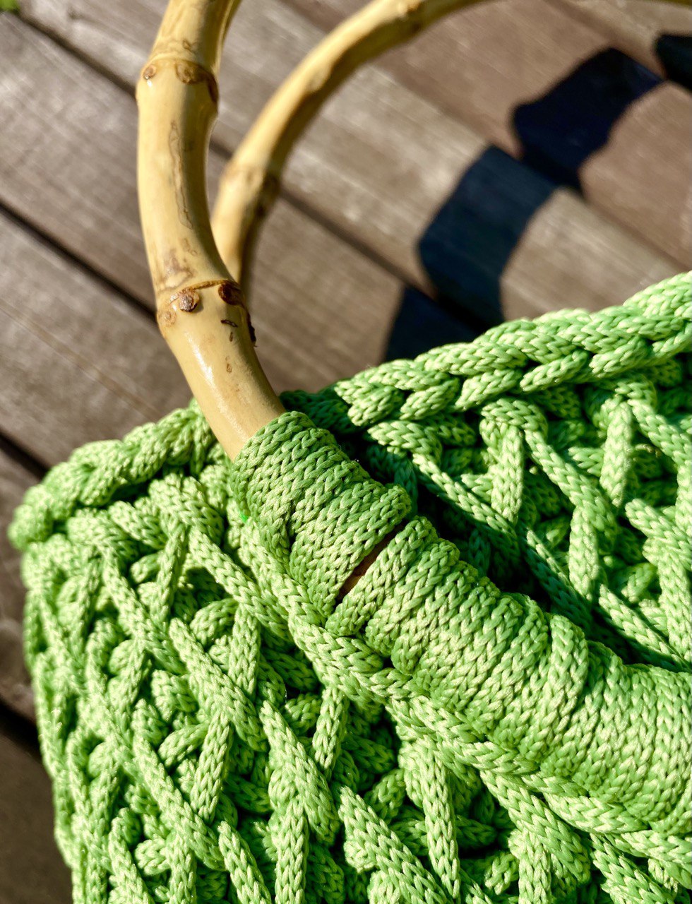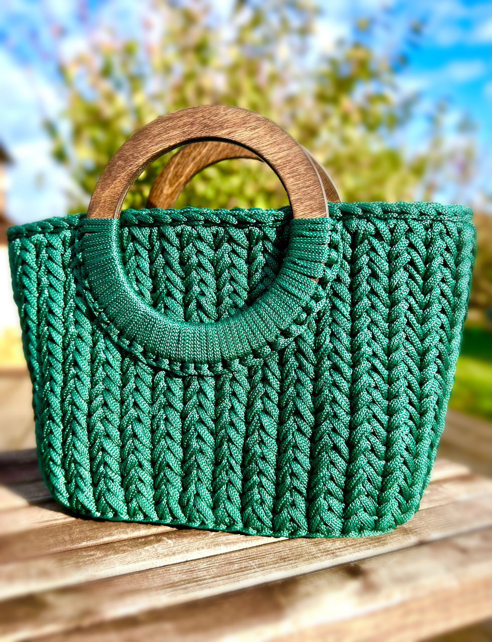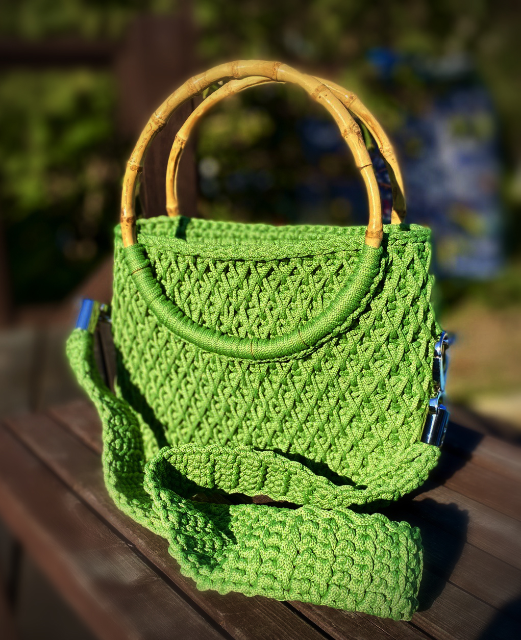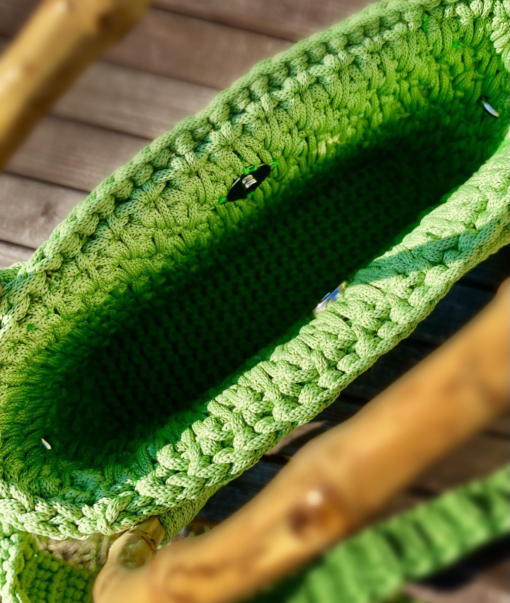 Сумочка "Соты-1" выполнены из полиэфирного шнура толщиной 3мм. Шнур плотный, износостойкий, не выгорает на солнце. Сумка очень элегантная, легкая, вместительная, модная. Бамбуковые ручки диаметр 16 см Цвет "Сочная трава" Под заказ цвет по желанию заказчика