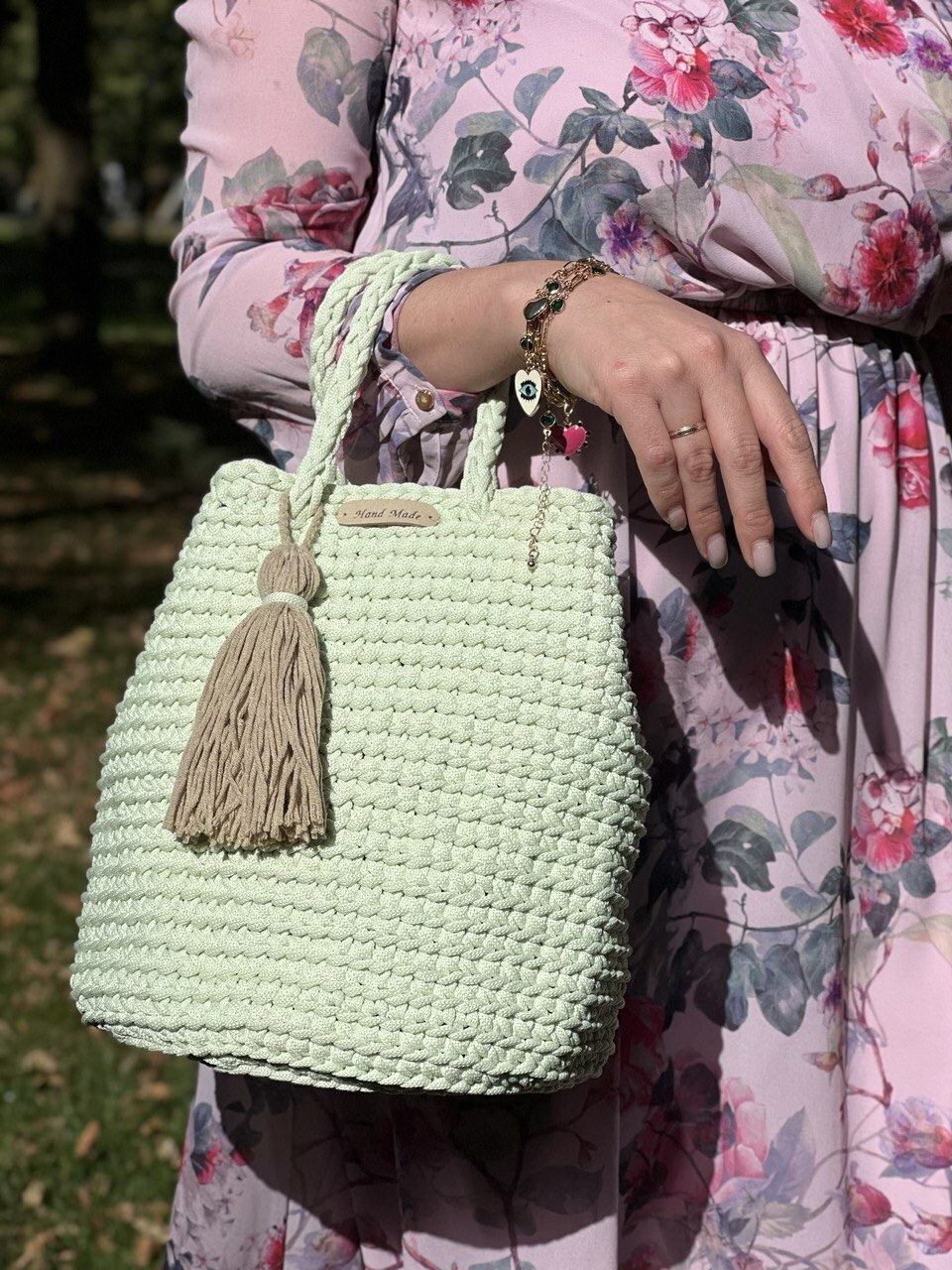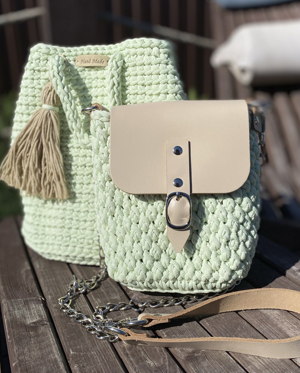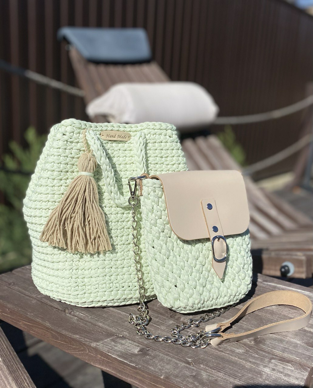 Сумка "Торба" и Мини сумка для телефона, выполнены из полиэфирного шнура толщиной 5мм. Шнур плотный, крупный, износостойкий, не выгорает на солнце. Сумка "Торба" очень легкая, вместительная, модная. Мини сумка отлично вмещает телефон, не большой кошелек , помаду и тд Цвет "Фисташка" Под заказ размер и цвет по желанию заказчика