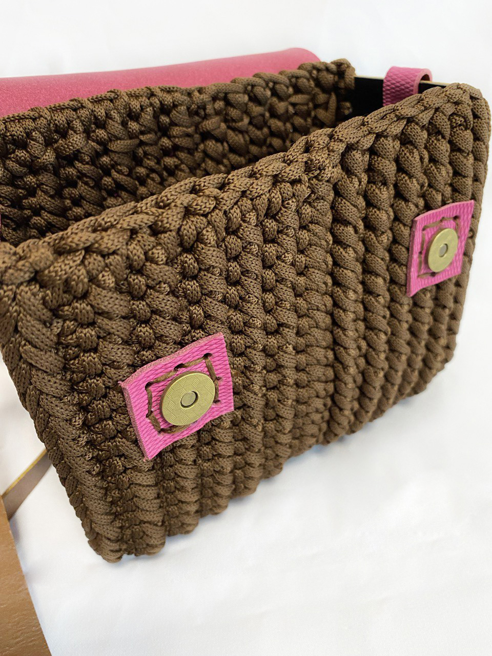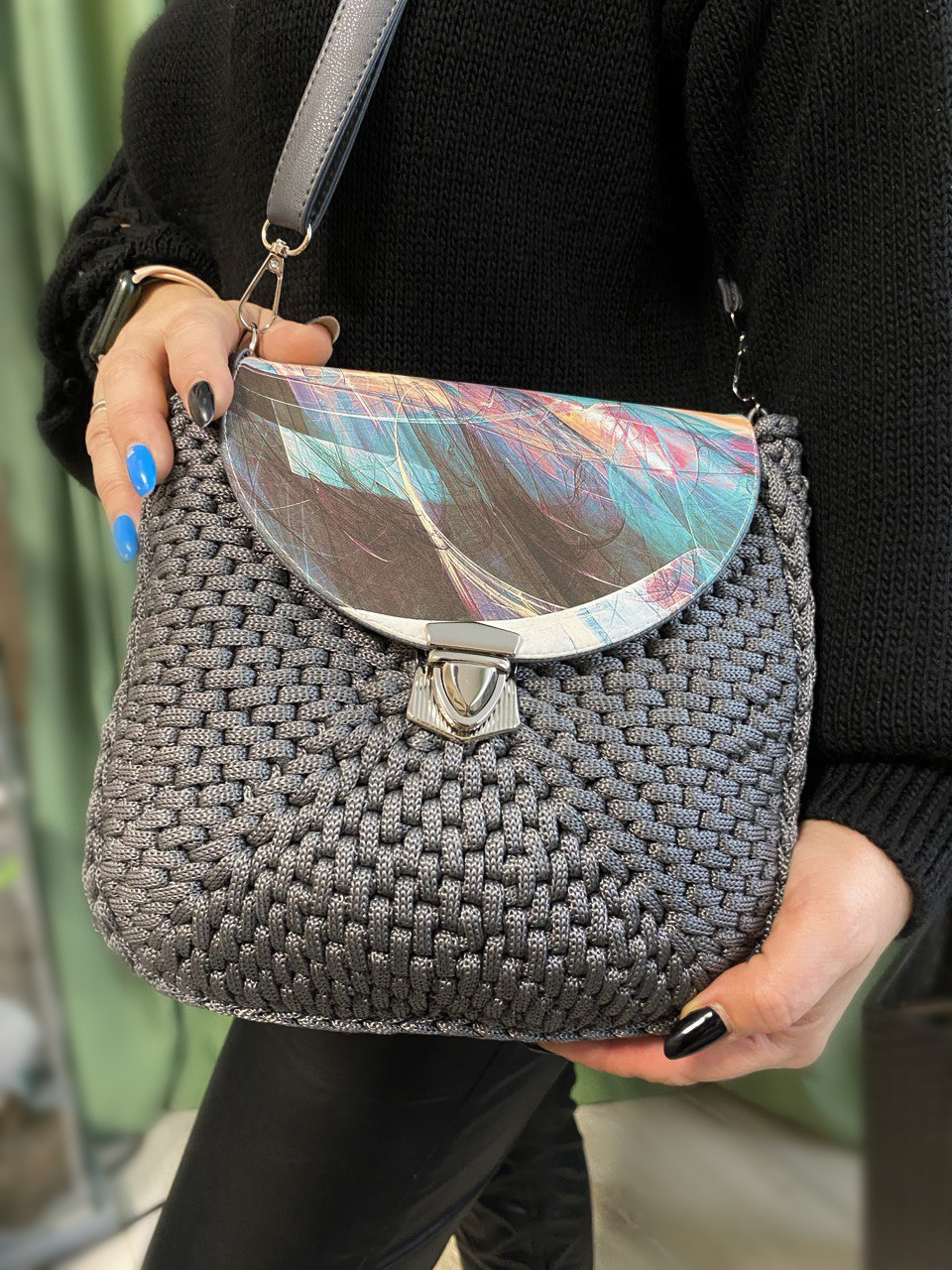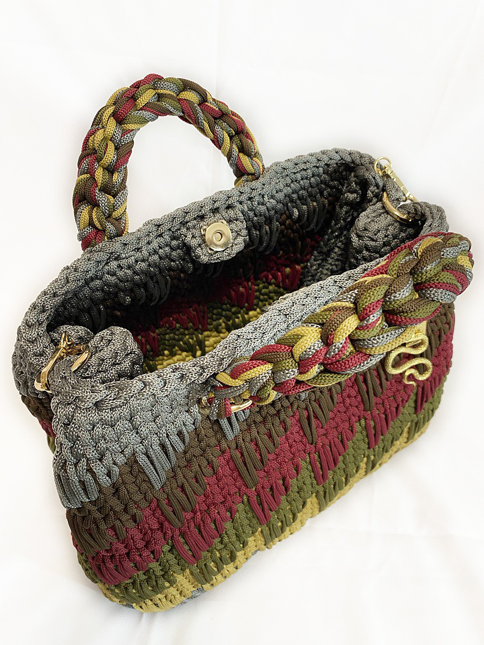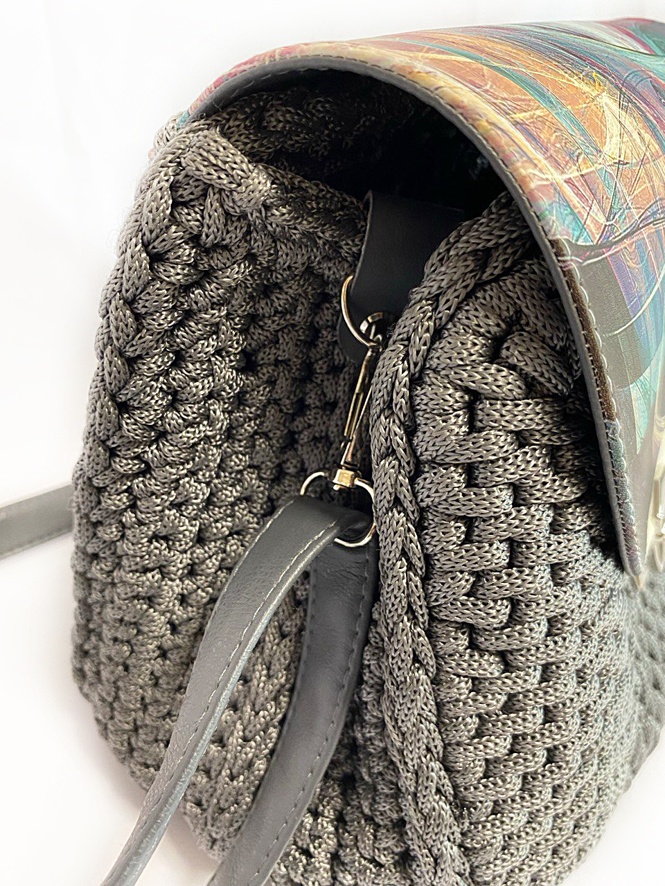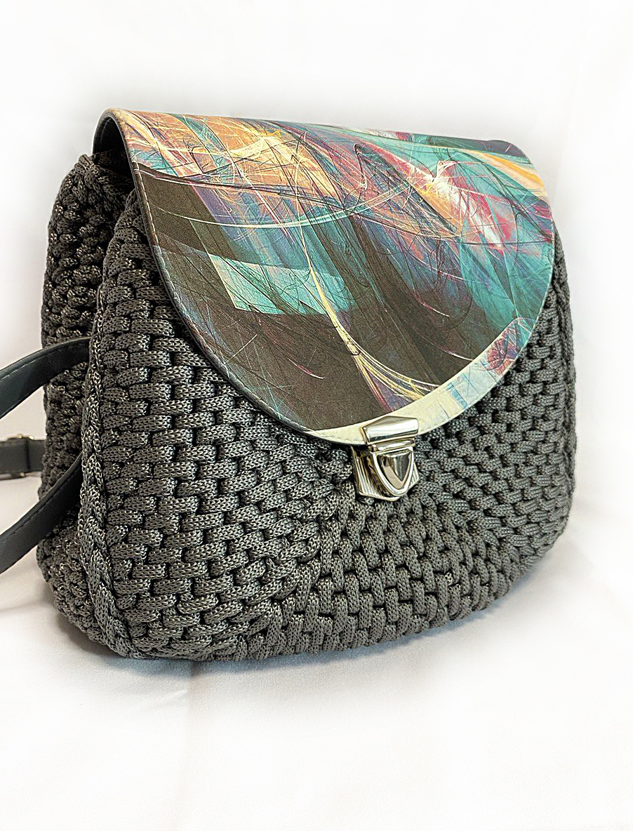 Выполнена из полиэфирного шнура толщиной 5 мм. длинна - 21см, ширина - 12см, высота - 19см Кожаная фурнитура: клапан, боковины и ремешок. Закрывается на магнитные кнопки.