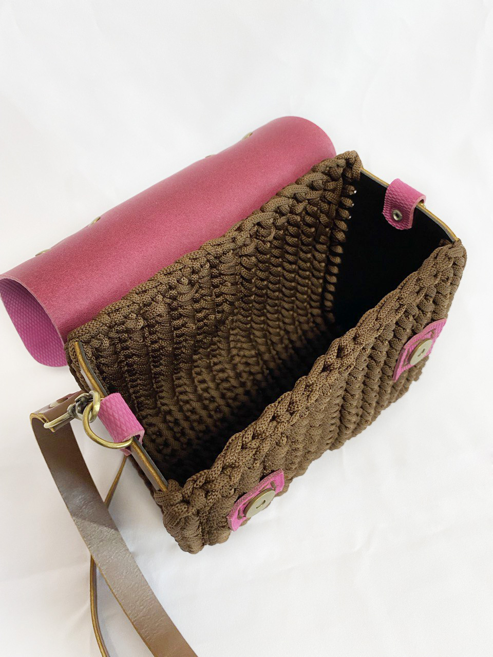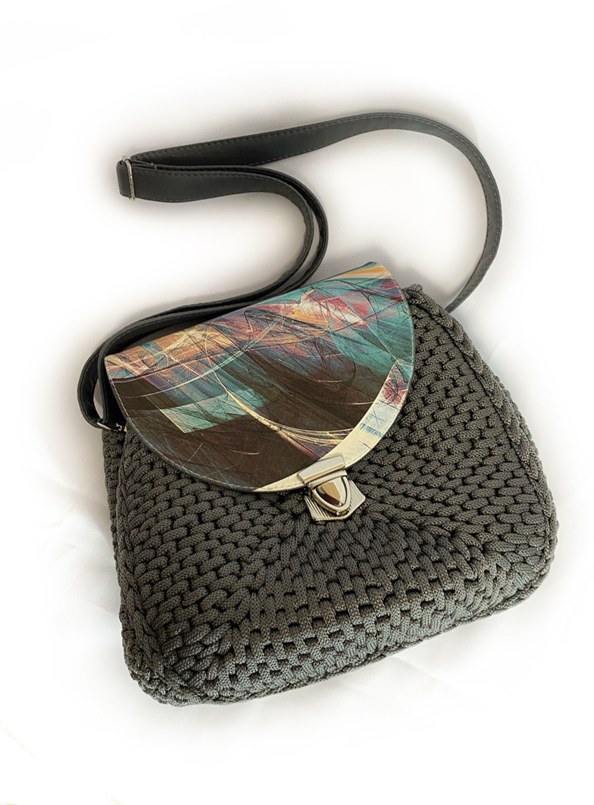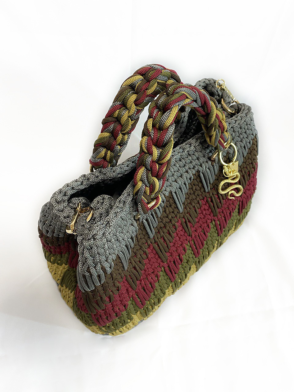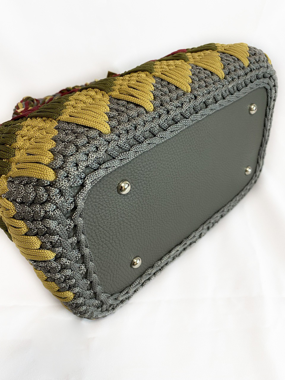 Выполнена из полиэфирного шнура толщиной 5 мм. длинна - 21см, ширина - 12см, высота - 19см Кожаная фурнитура: клапан, боковины и ремешок. Закрывается на магнитные кнопки.