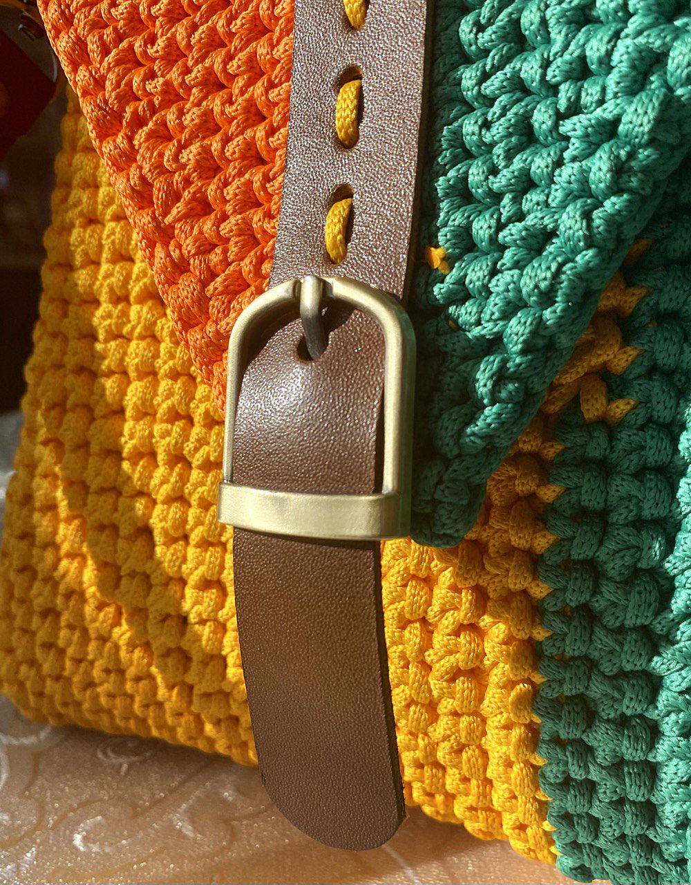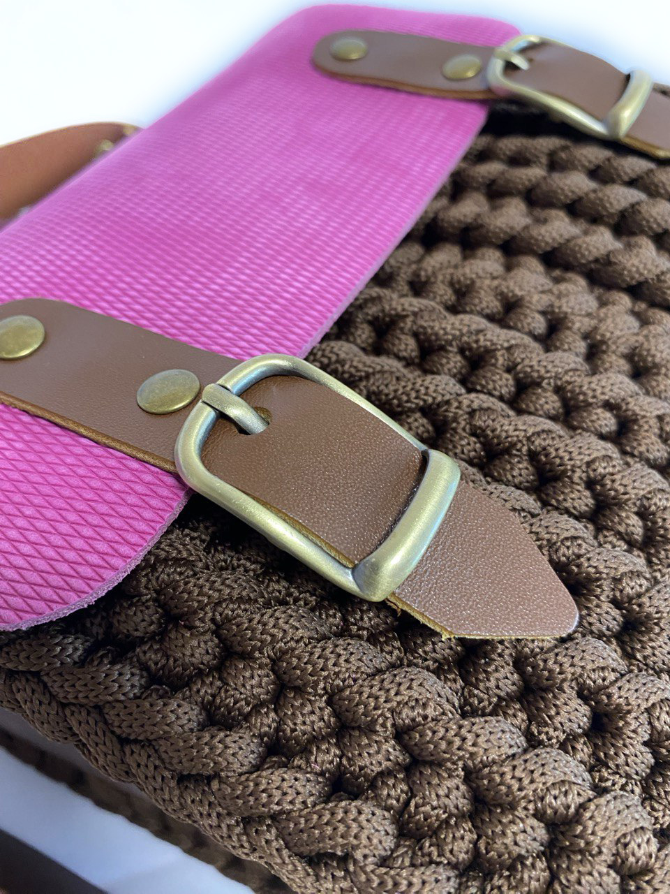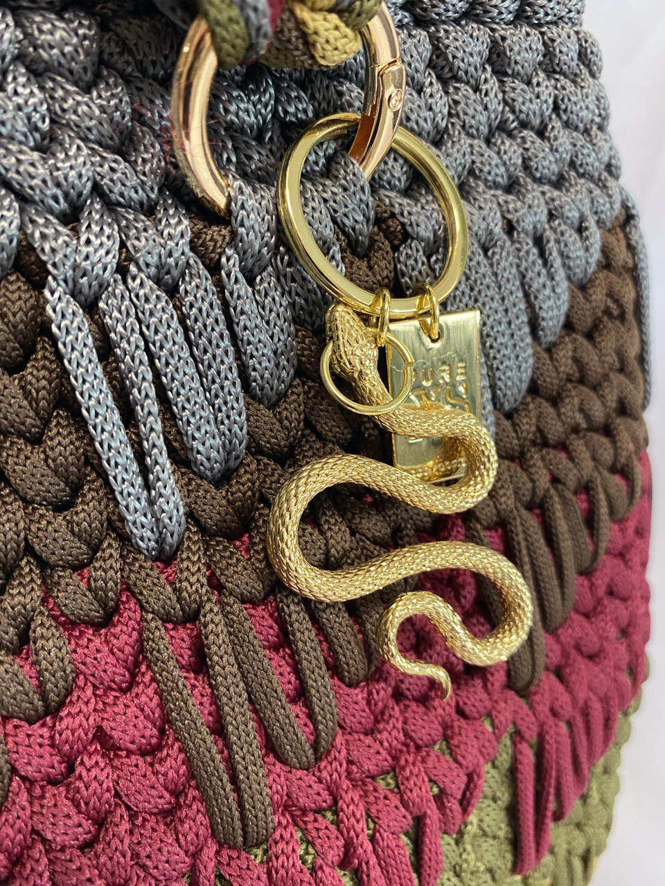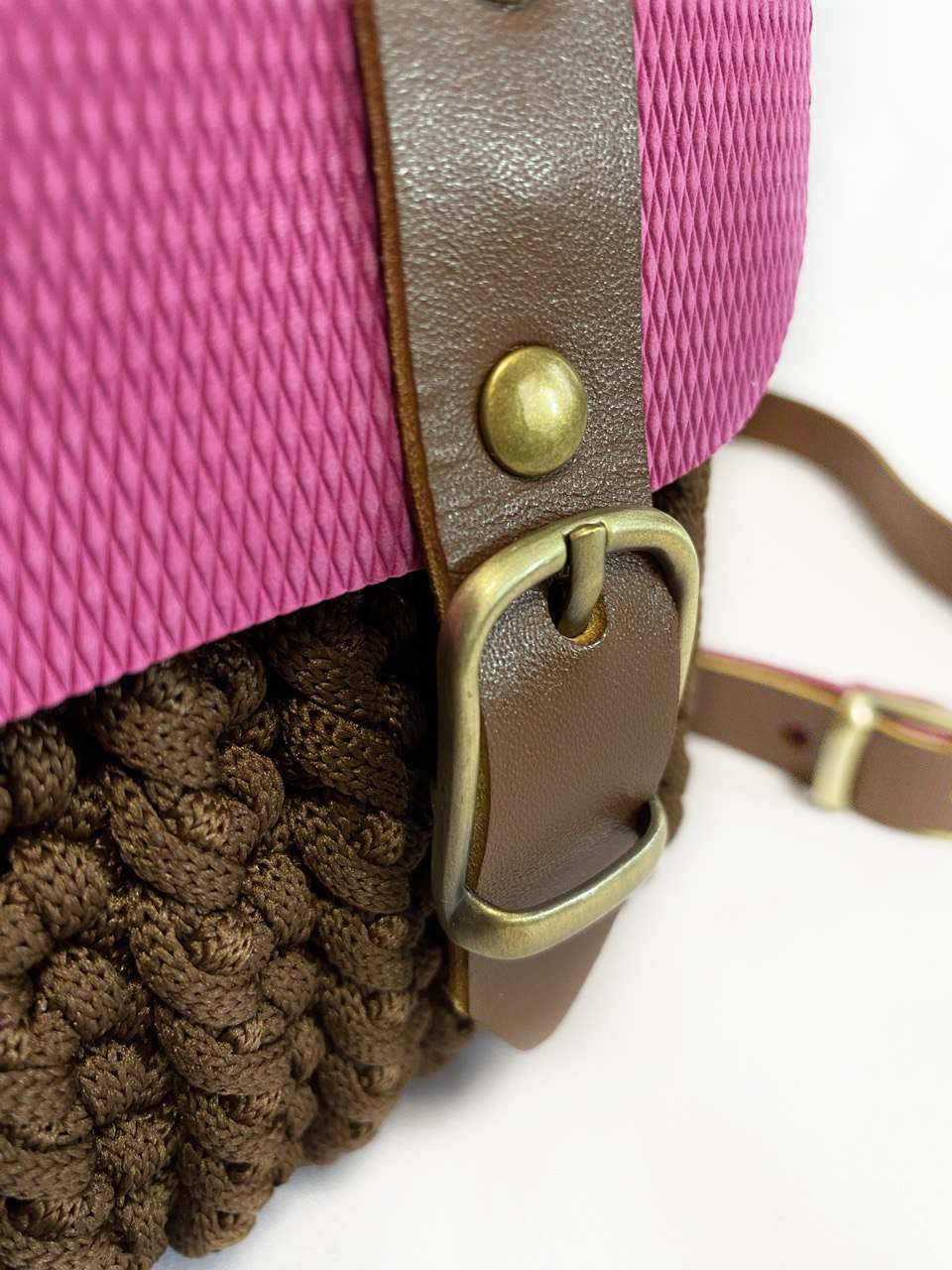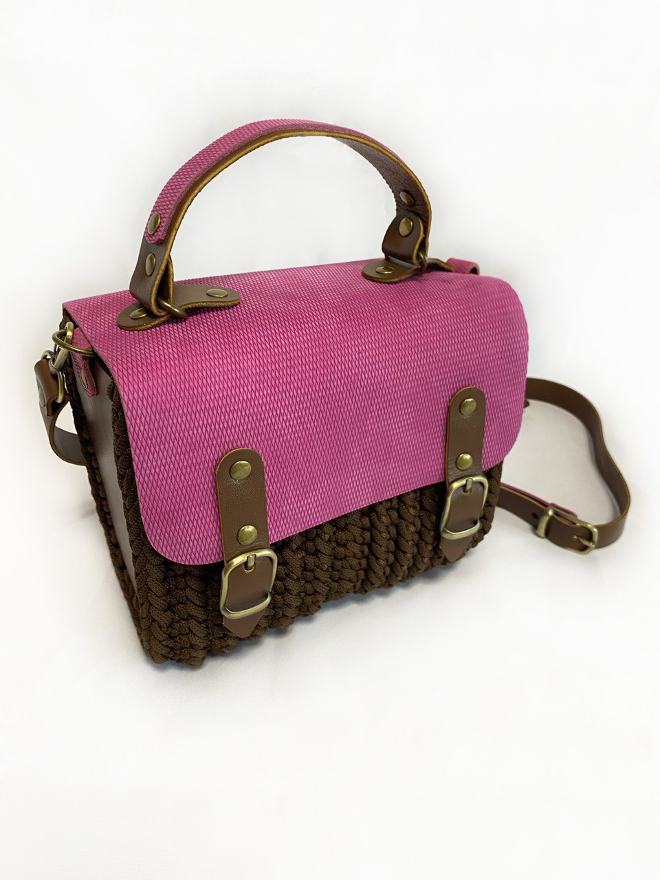 Выполнена из полиэфирного шнура толщиной 5 мм. длинна - 21см, ширина - 12см, высота - 19см Кожаная фурнитура: клапан, боковины и ремешок. Закрывается на магнитные кнопки.