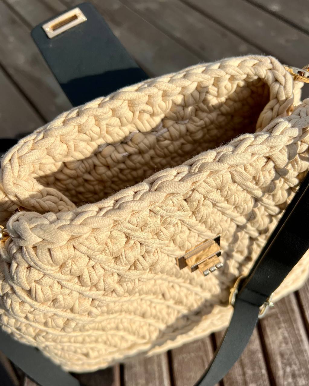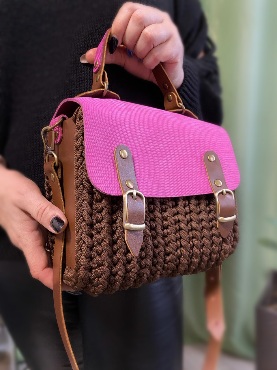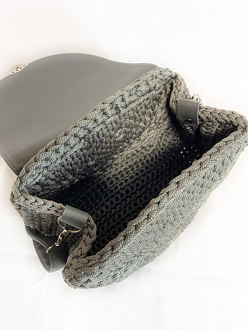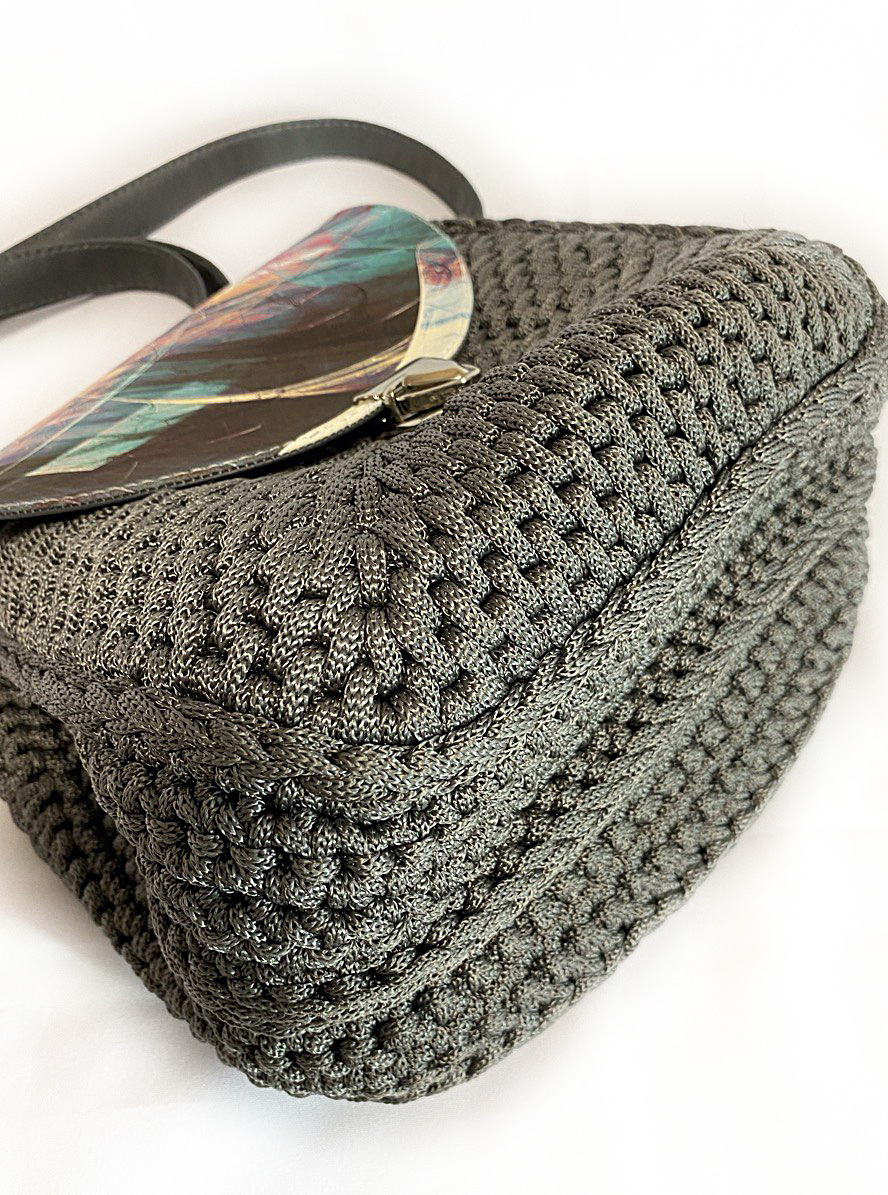 Выполнена из полиэфирного шнура толщиной 5 мм. длинна - 21см, ширина - 12см, высота - 19см Кожаная фурнитура: клапан, боковины и ремешок. Закрывается на магнитные кнопки.
