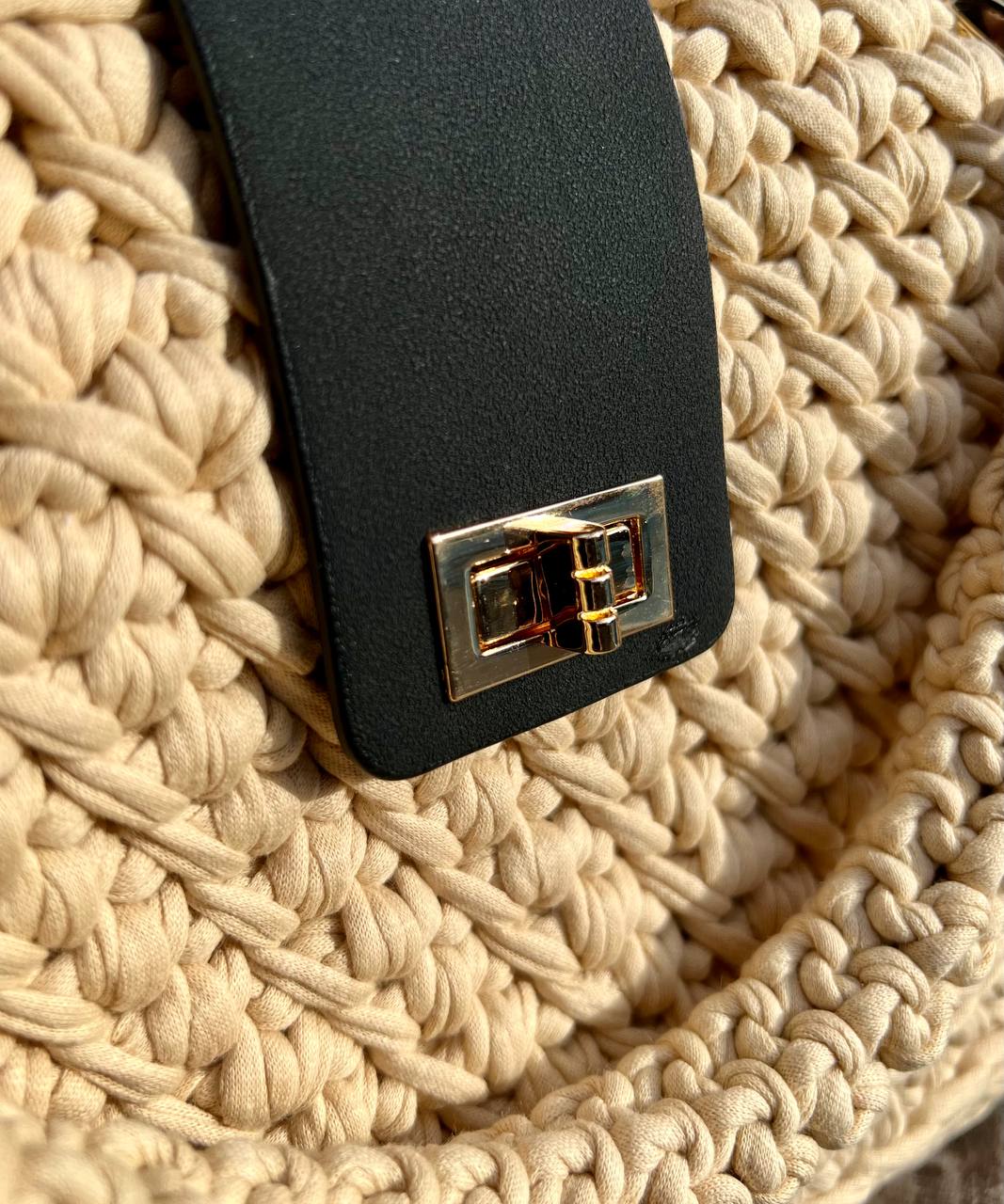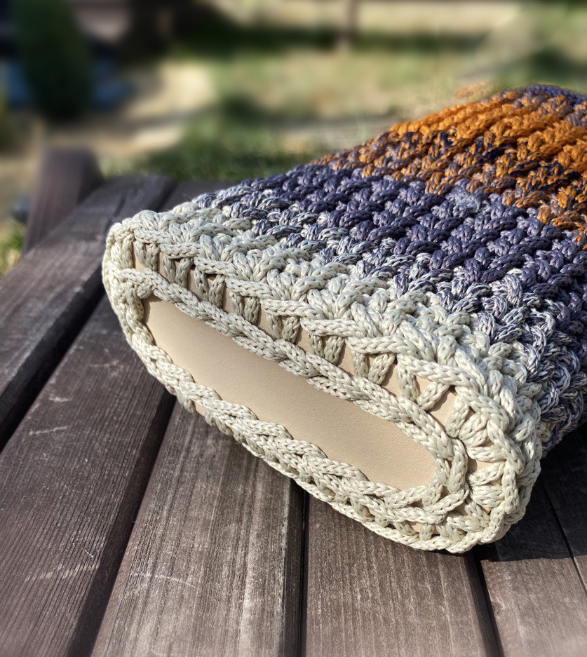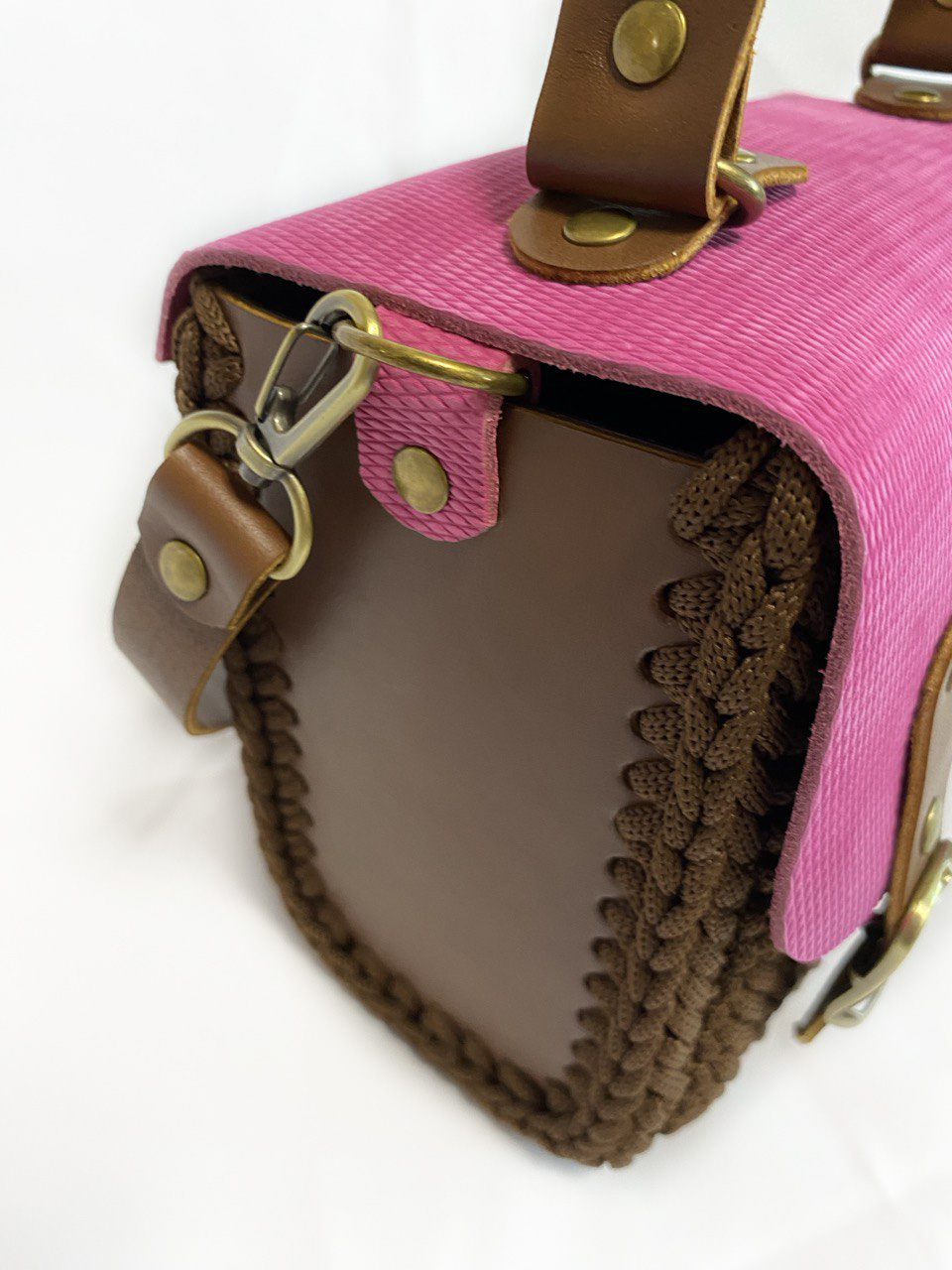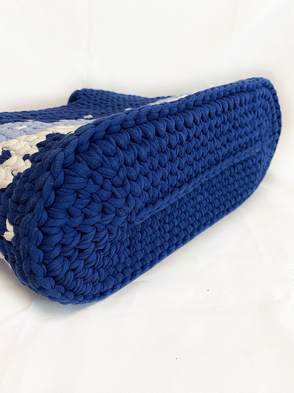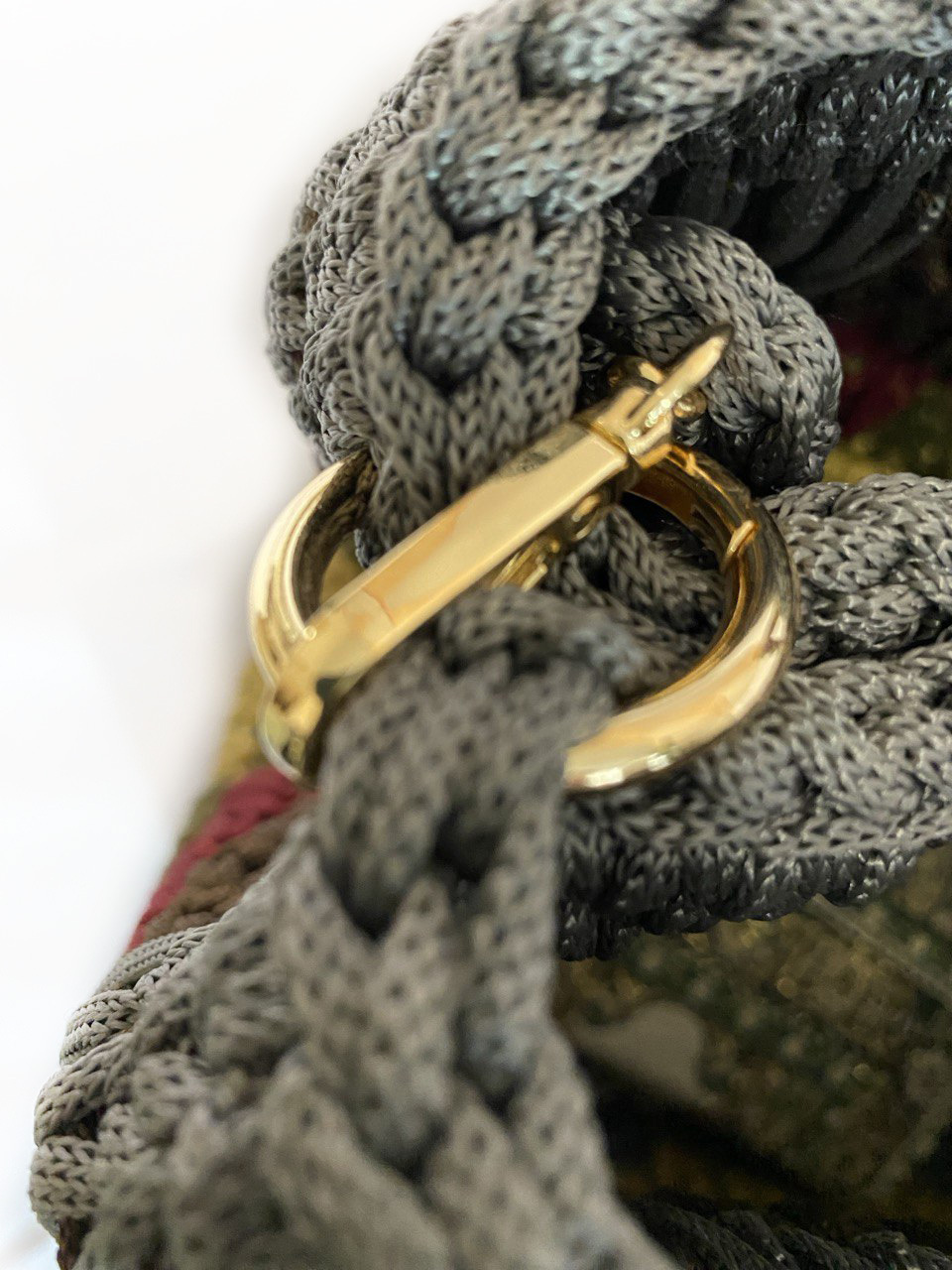 Выполнена из полиэфирного шнура толщиной 5 мм. длинна - 21см, ширина - 12см, высота - 19см Кожаная фурнитура: клапан, боковины и ремешок. Закрывается на магнитные кнопки.