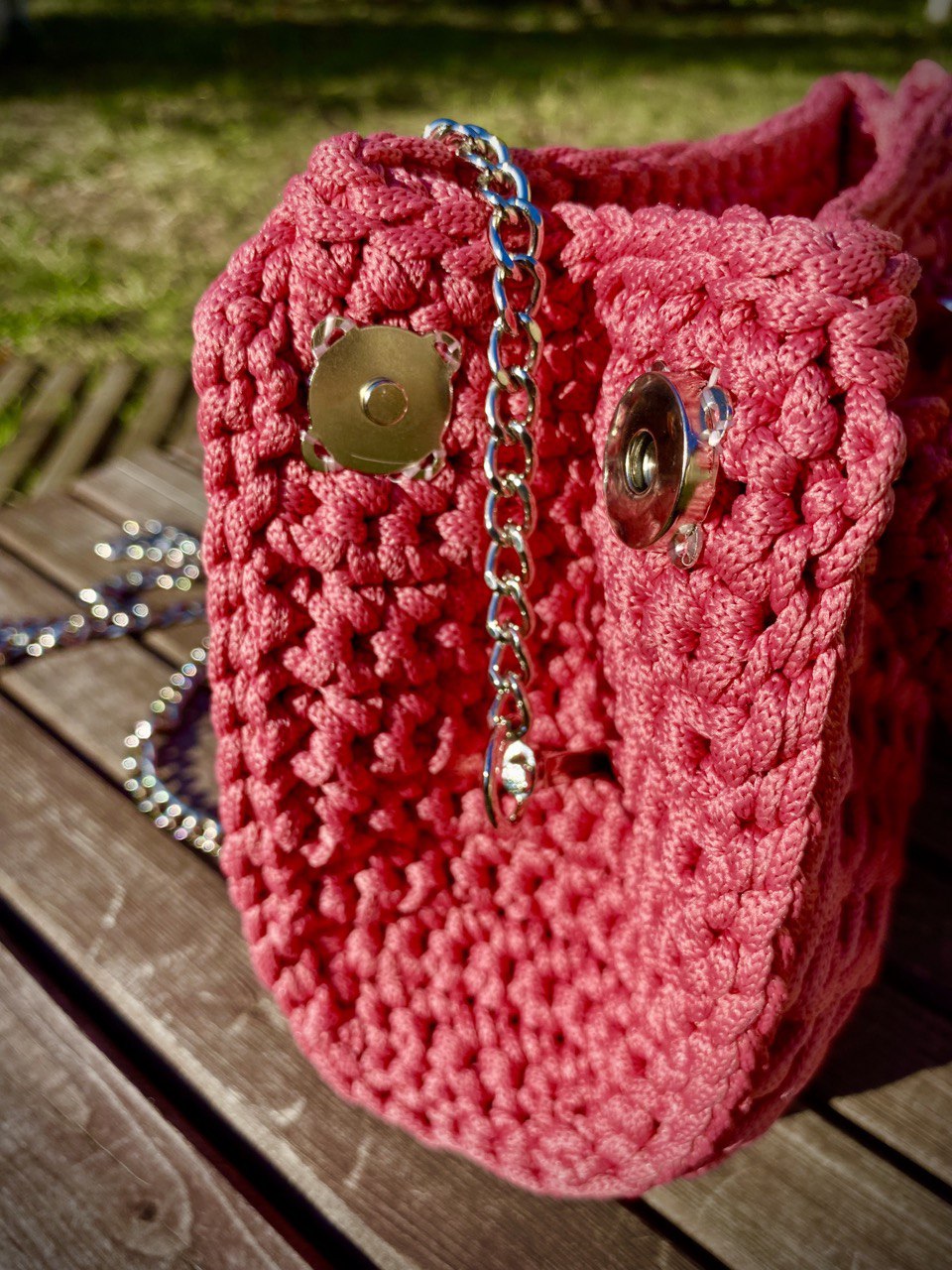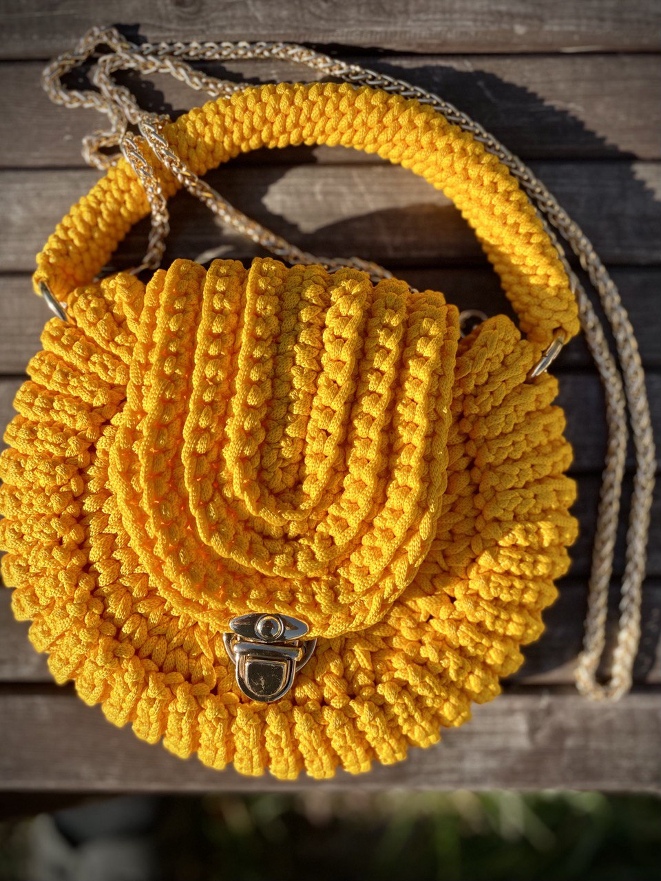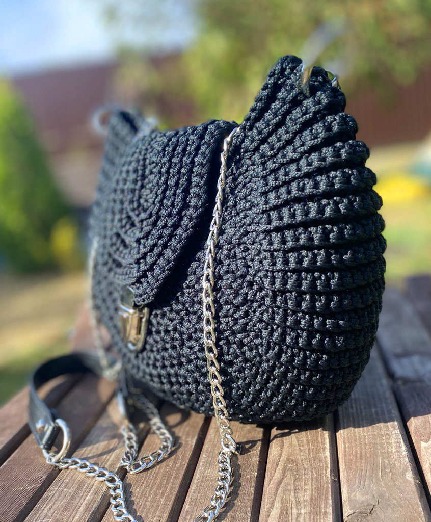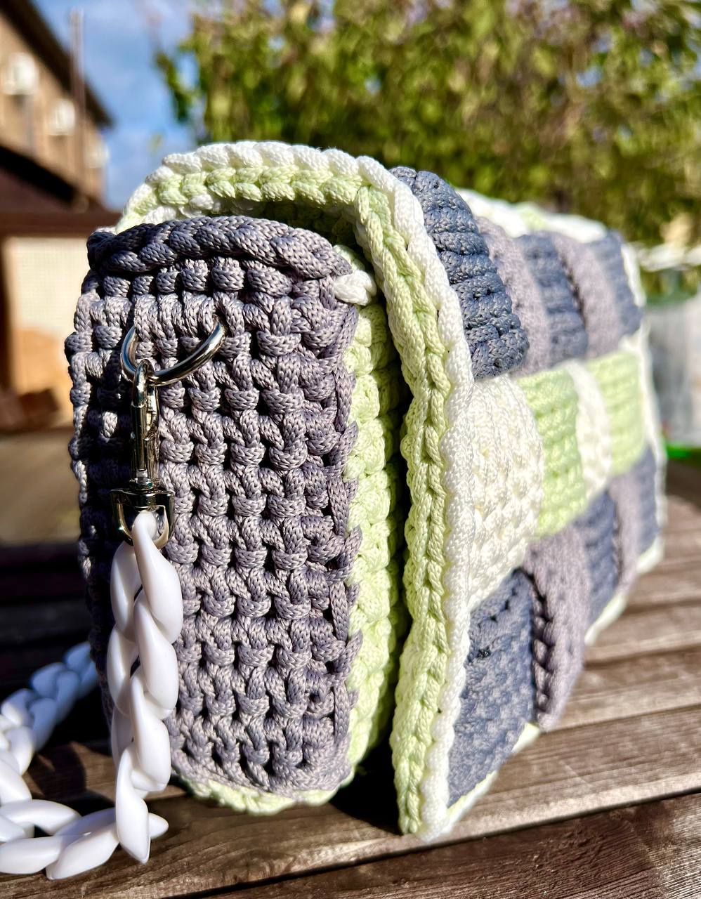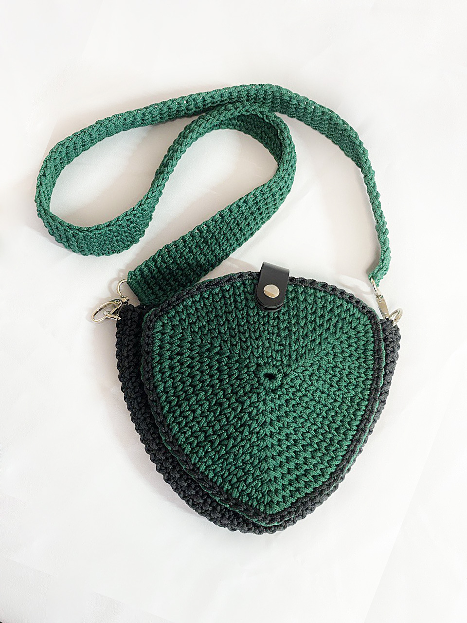 Сумочка выполнена из полиэфирного шнура толщиной 2мм Треугольной формы, застежка кнопка экокожа. вязанный ремешок. отлично сммотрится как со спортивной одеждой, так и с легким платьем. Размер готовой сумки 18х18х18 см