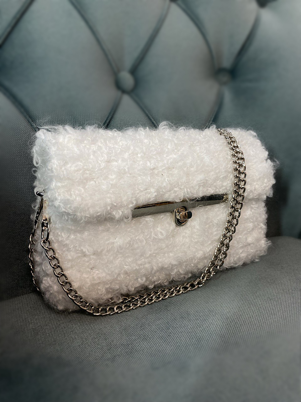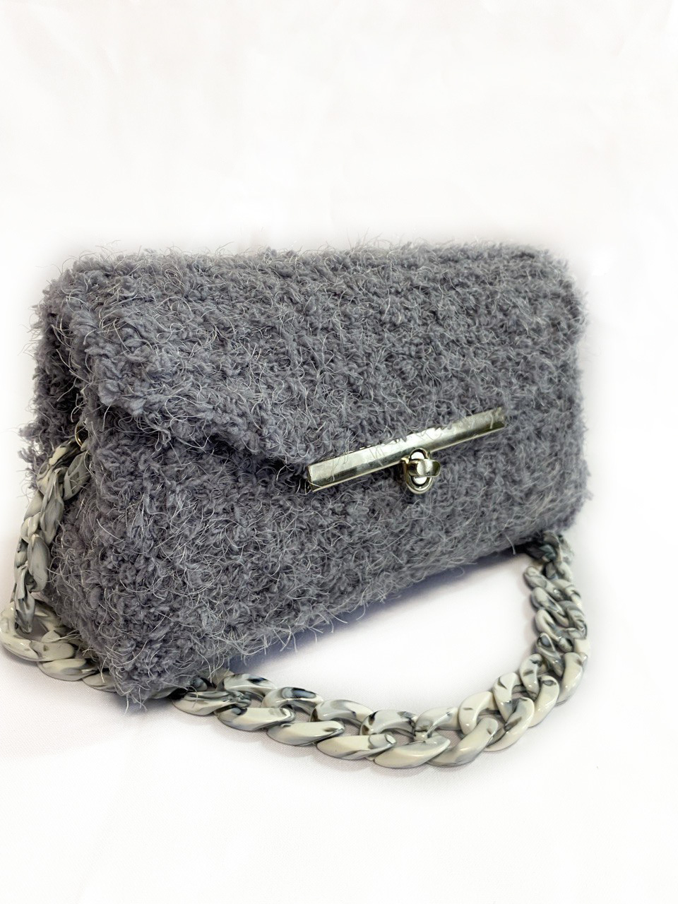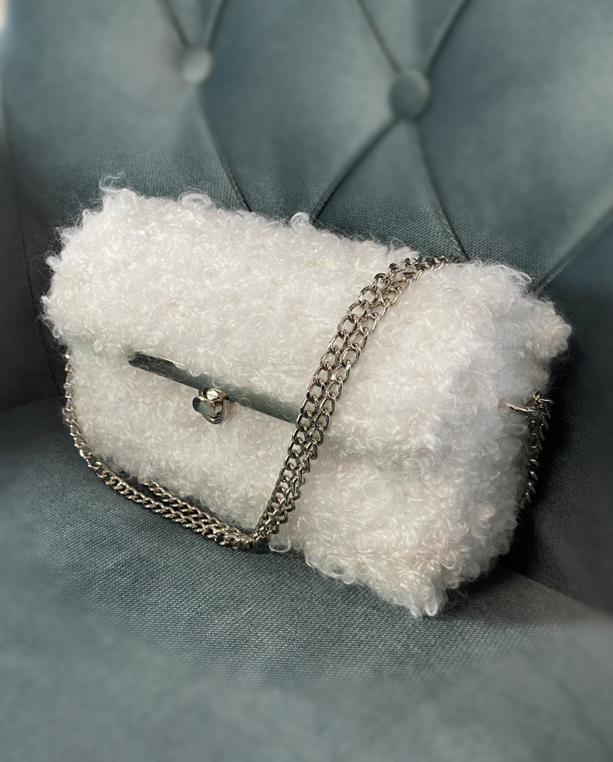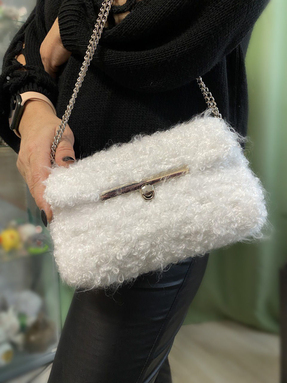 Сумочка Выполнена из буклированной пряжи на канве. Акриловый ремешок, застежка цвет серебро. Размеры готовой сумки 23х16х6 см. Отлично подойдет под вечерний наряд. Смотрится элегантно.