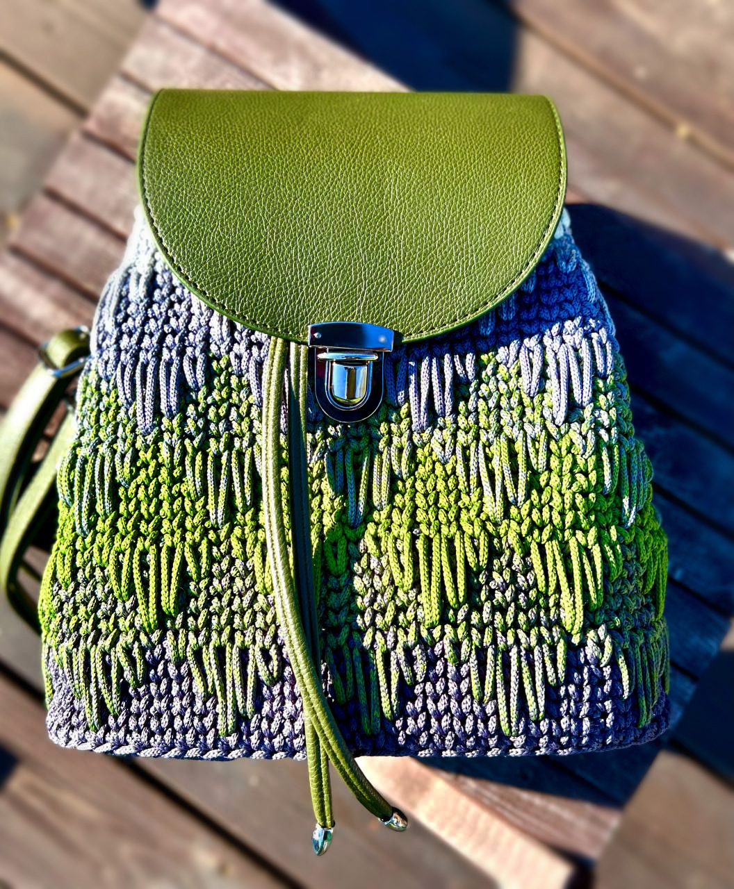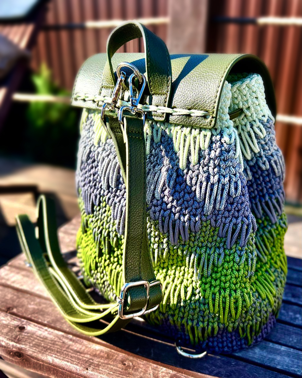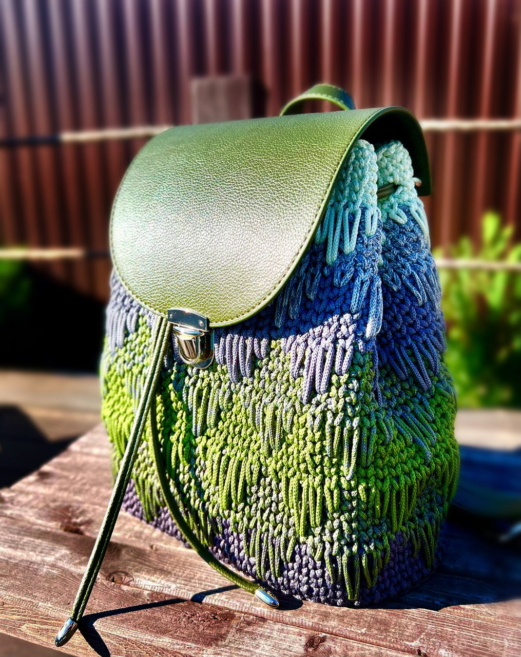 Рюкзак выполнен из полиэфирного шнура шириной 3мм градиент "Скандинавия". Структура нити мягкая и приятная на ощупь. в/ш/д 30см/14см/25см Качественная фурнитура из экокожи, подклад из плотной ткани