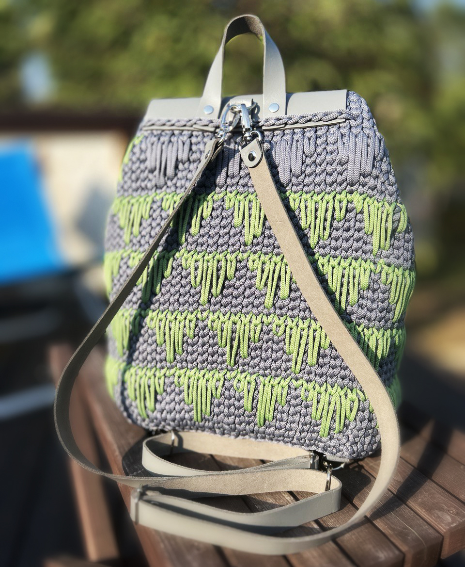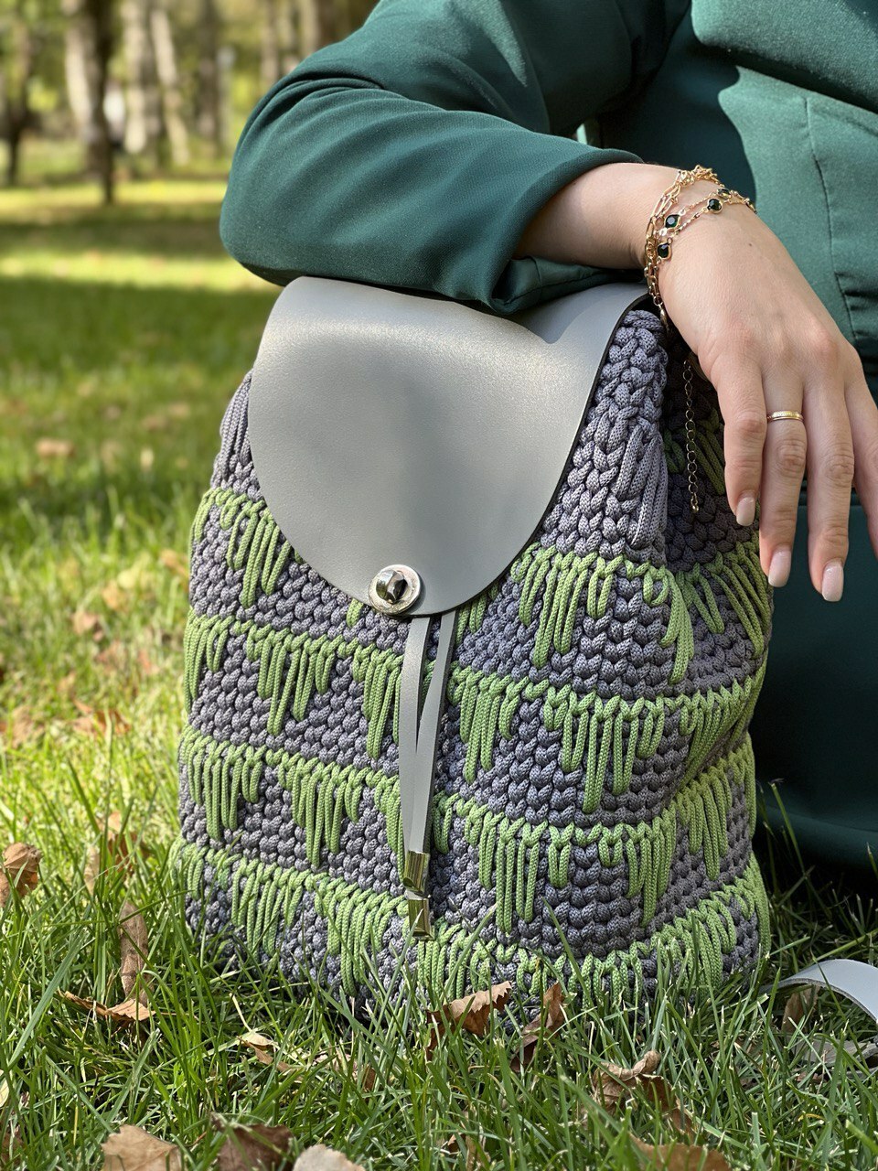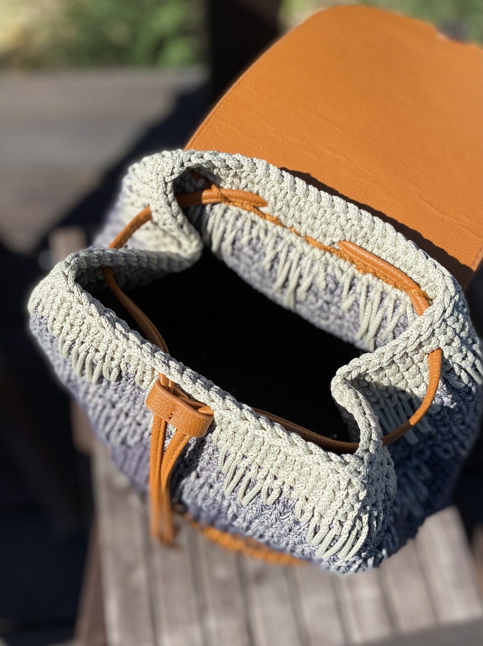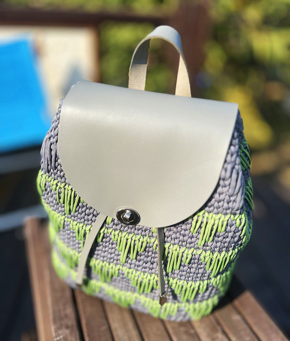 Рюкзак выполнен из полиэфирного шнура шириной 5мм и 3мм Комбинированная нить 2х цветов. Структура нити мягкая и приятная на ощупь. в/ш/д 30см/14см/25см Качественная фурнитура из экокожи, подкладка из плотной ткани