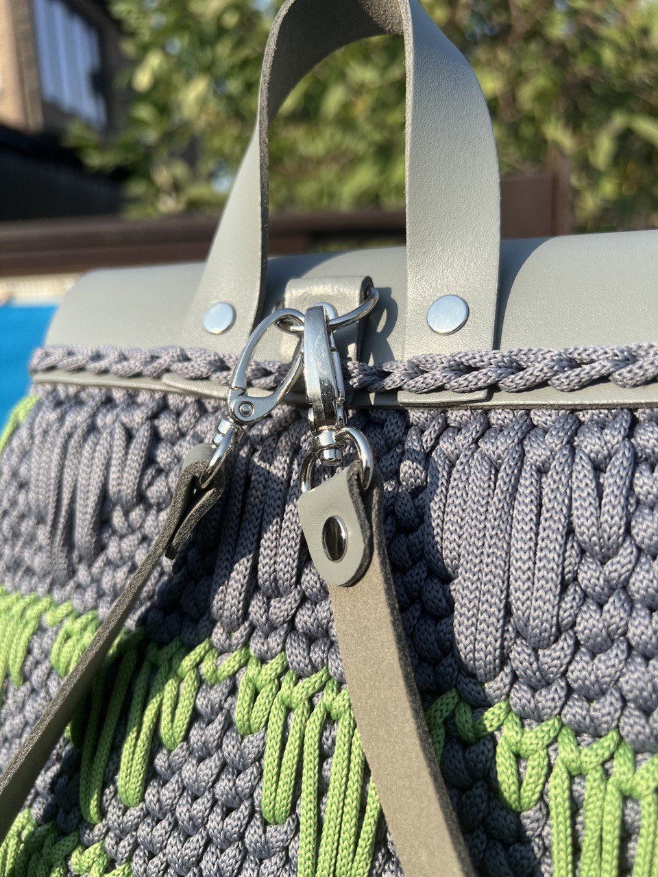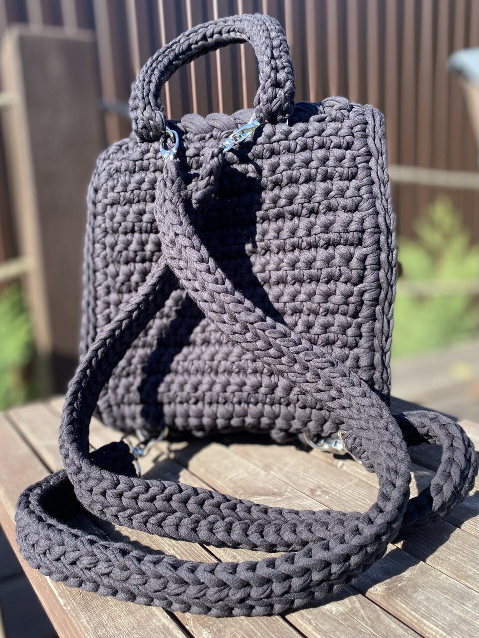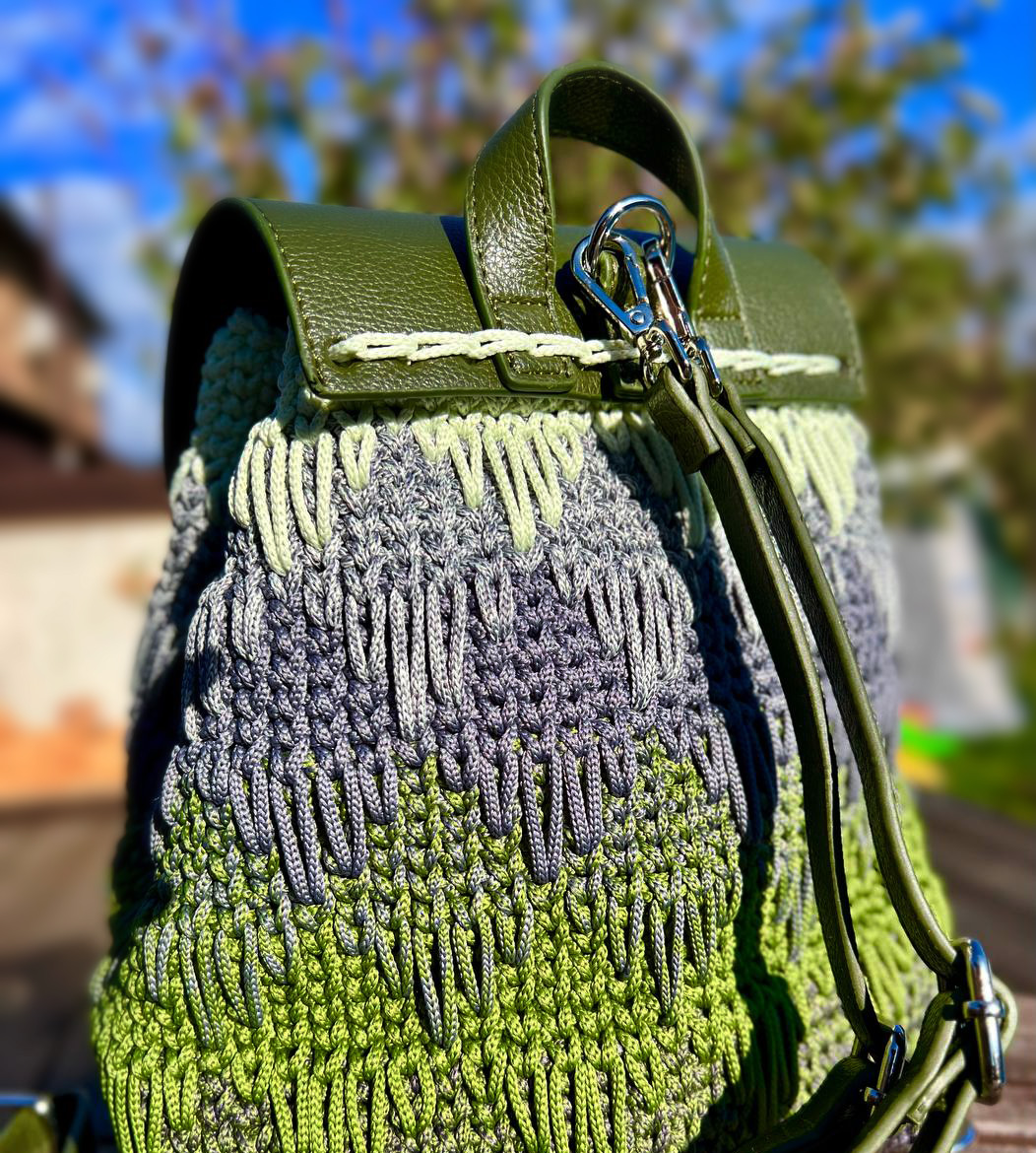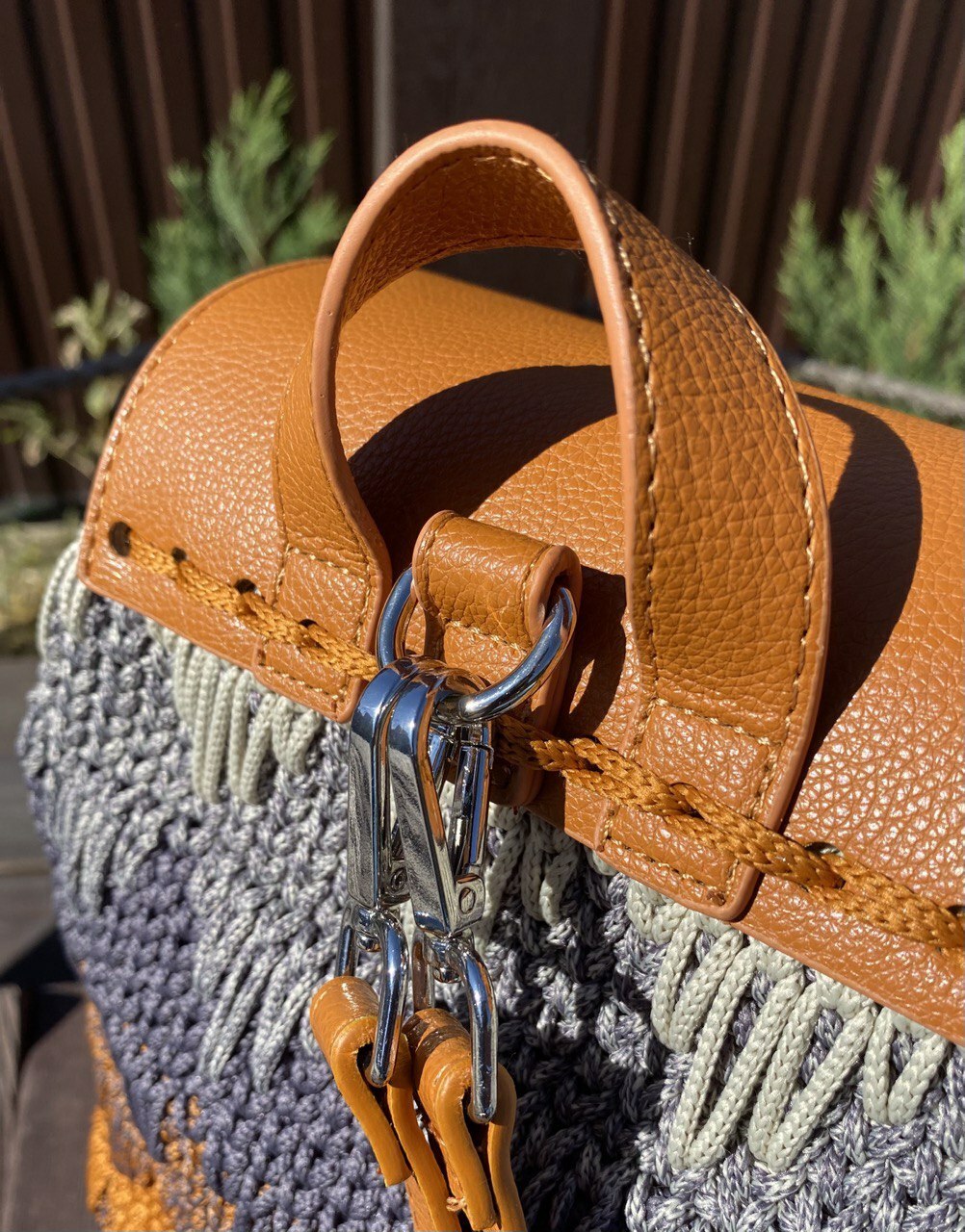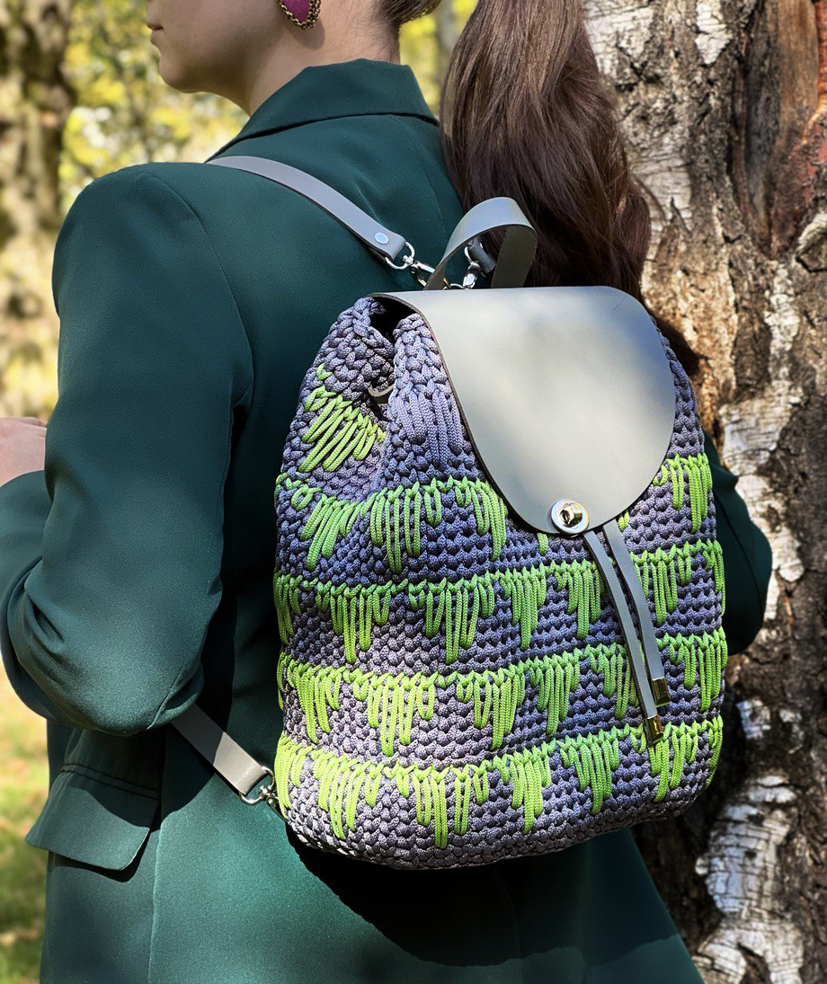 Рюкзак выполнен из полиэфирного шнура шириной 5мм и 3мм Комбинированная нить 2х цветов. Структура нити мягкая и приятная на ощупь. в/ш/д 30см/14см/25см Качественная фурнитура из экокожи, подкладка из плотной ткани