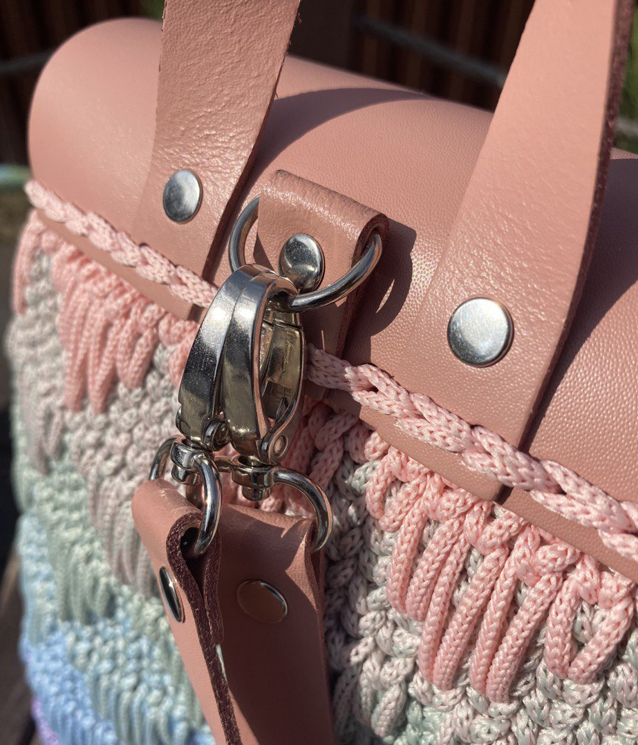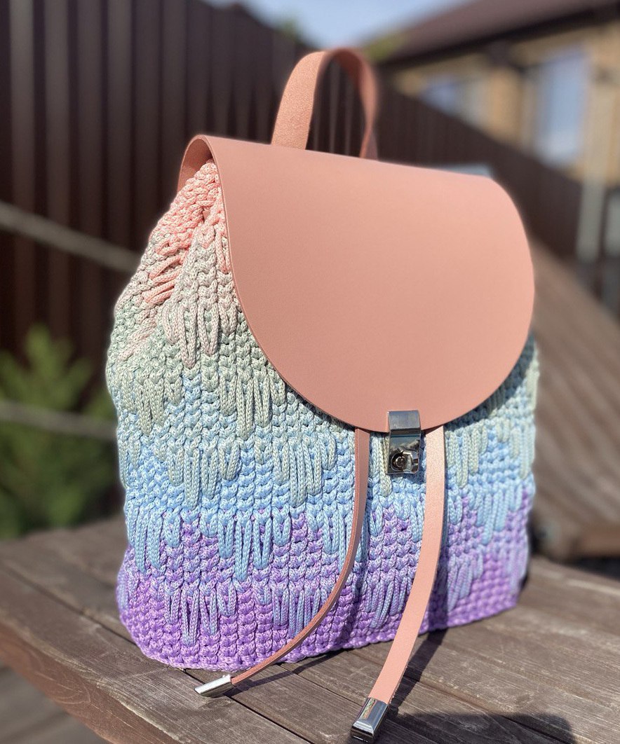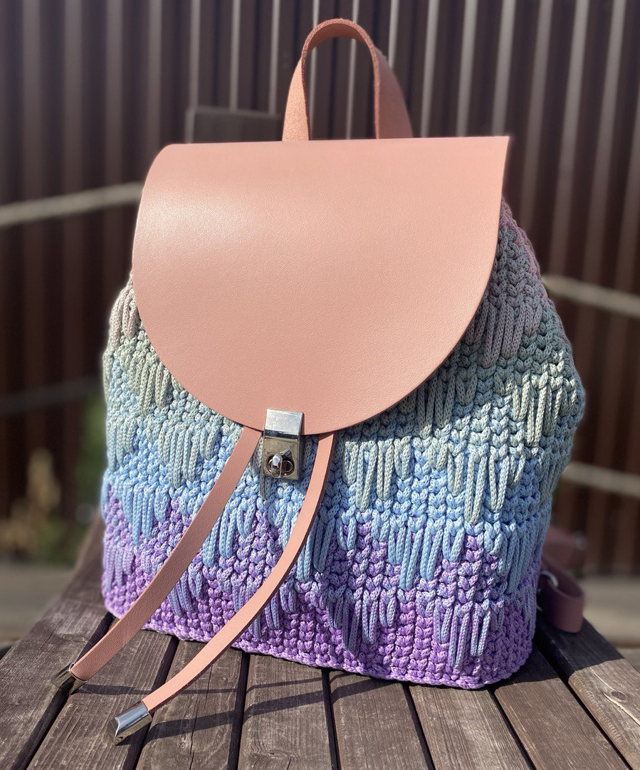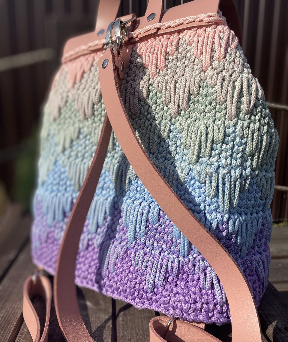Рюкзак выполнен из полиэфирного шнура шириной 3мм градиент "Леденец". Структура нити мягкая и приятная на ощупь. в/ш/д 25см/14см/25см Качественная фурнитура из экокожи, подклад из плотной ткани