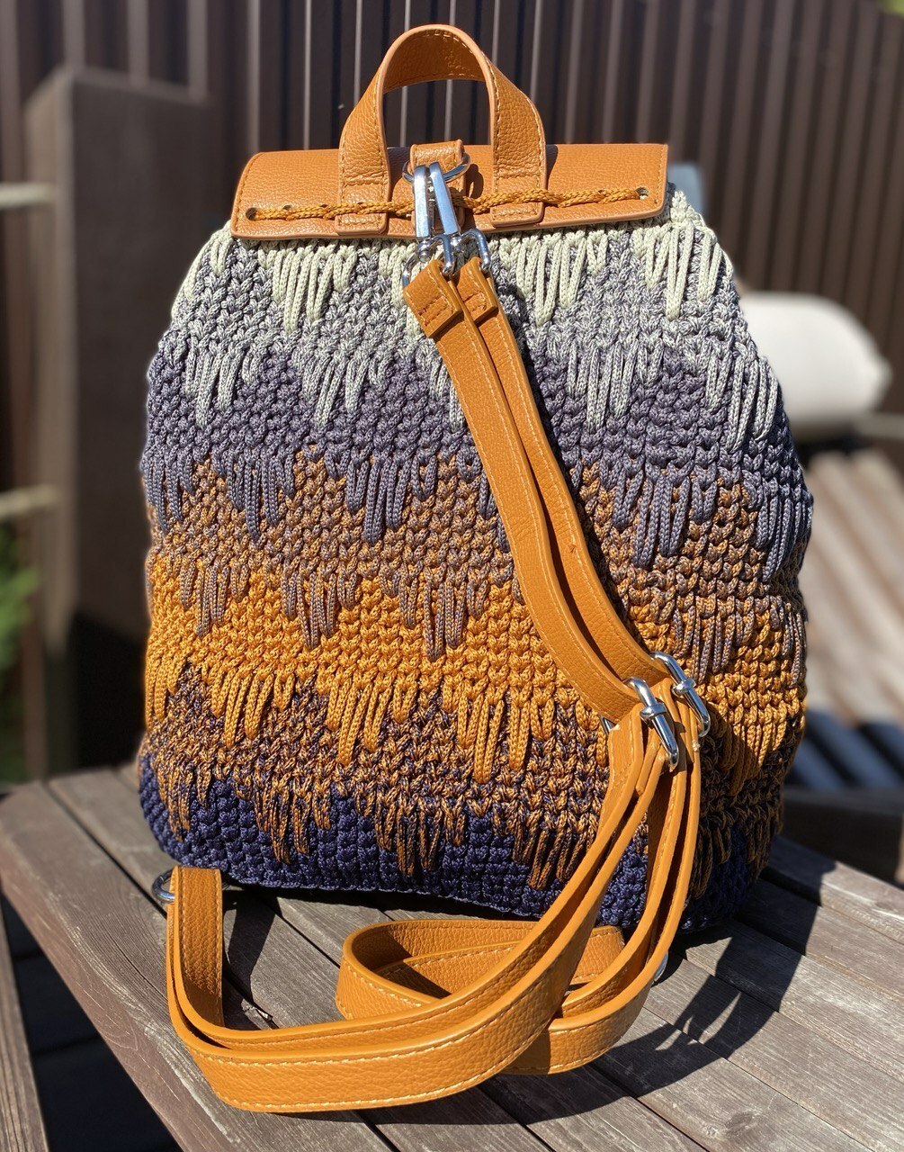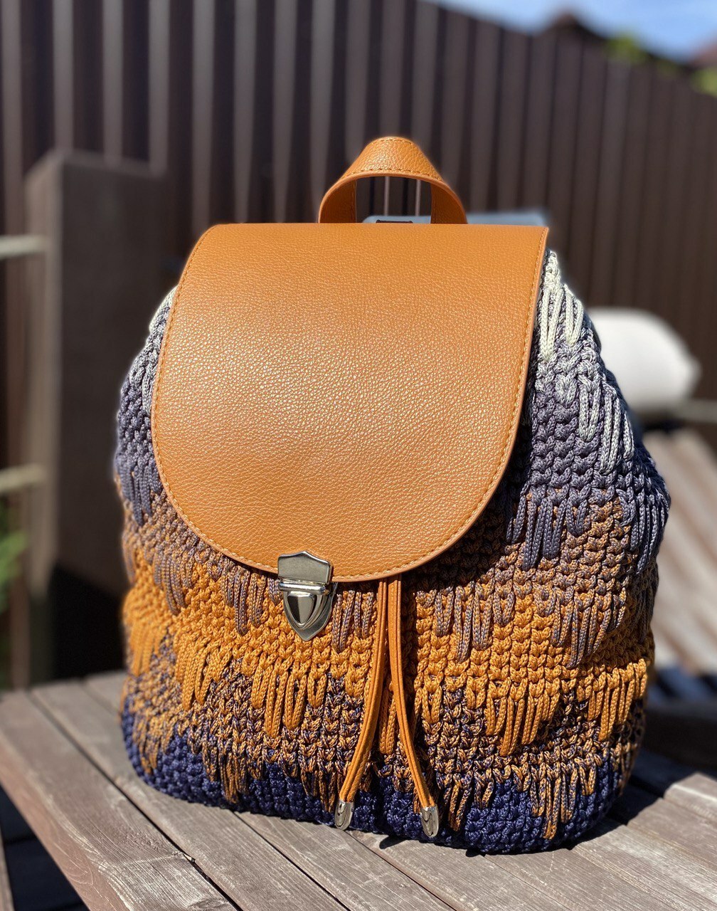 Рюкзак выполнен из полиэфирного шнура шириной 3мм градиент "Осенний блюз". Структура нити мягкая и приятная на ощупь. в/ш/д 30см/14см/25см Качественная фурнитура из экокожи, подклад из плотной ткани